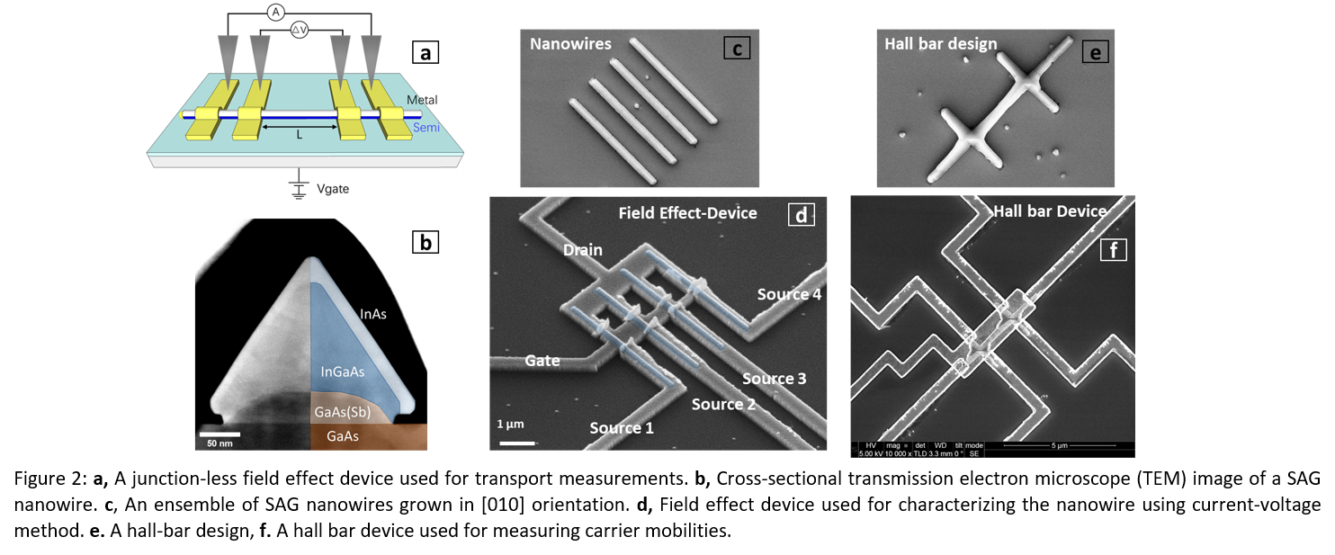 As we progressed, we realized that the quality of platform does not meet the requirements of forming clear evidence of such quantum states. So, focus changed to improve the growth process and resulted in 6 publications and many more promising experiments are on the way. As an example, we have successfully grown SAG nanowires (Figure 2b), achieved dislocation free interfaces and significantly improved purity.