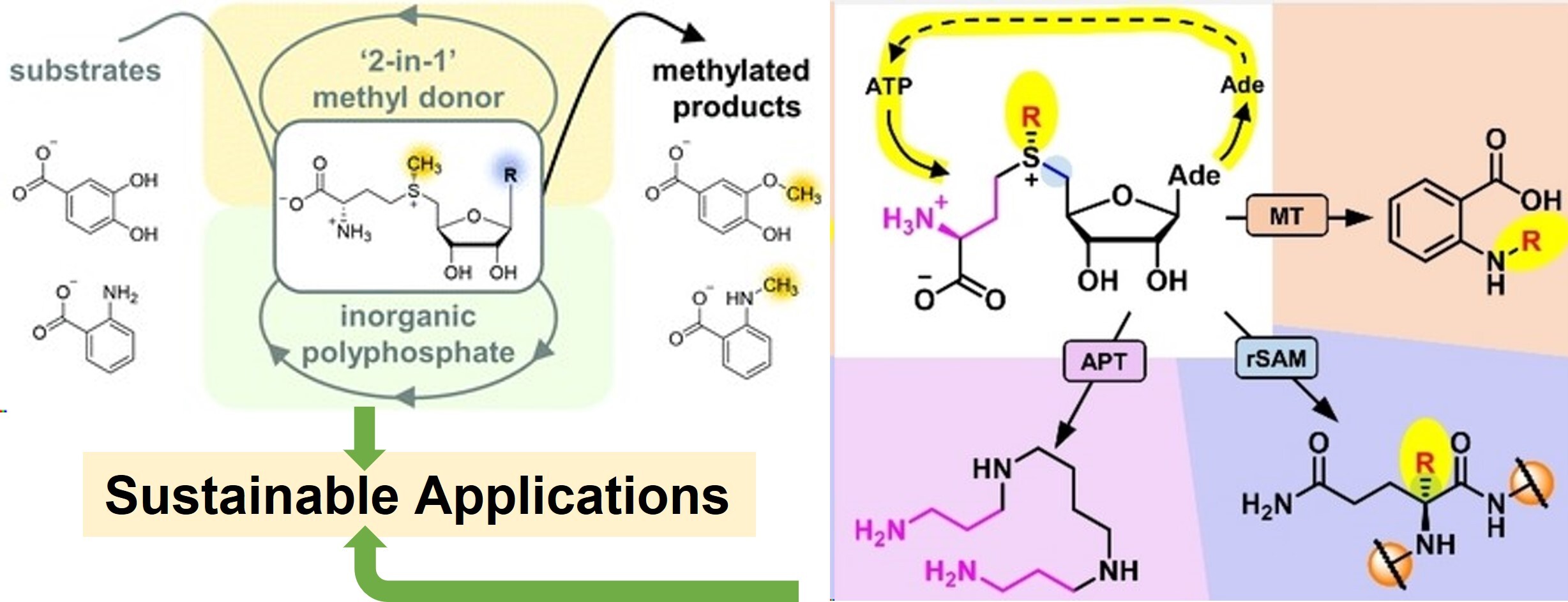 S-adenosylmethionine (SAM)-dependent enzymes play an important role in all kingdoms of life. SAM is used as a methyl donor for the methylation of small molecules, proteins, and ribonucleic acids by conventional methyltransferases. It is further the cofactor for radical SAM enzymes that can catalyse a multitude of complex reactions, including methylations at unactivated positions. In the wide field of epigenetics, methylations are also an important marker, an example are methylations of nucleobases that are introduced by conventional and radical SAM methyltransferases. The reactions catalysed by SAM-dependent enzymes are highly interesting for technical application, e.g. the synthesis of selectively methylated building blocks for pharmaceuticals. Often, the corresponding synthetically-chemical version of the reaction uses highly toxic and cancerogenic compounds and is rather unselective. In the AppSAM project, we developed strategies to integrate SAM-dependent enzymes in multi-enzyme cascades to facilitate their handling and efficiency for chemical synthesis. These systems are also useful for the mechanistic-functional investigation of SAM-dependent enzymes, e.g. from epigenetic pathways or natural product biosynthesis, using modified (co-)substrates that can be produced in situ. In addition to in vitro multienzyme systems, different in vivo systems have been explored with a range of enzyme/ substrate combinations.