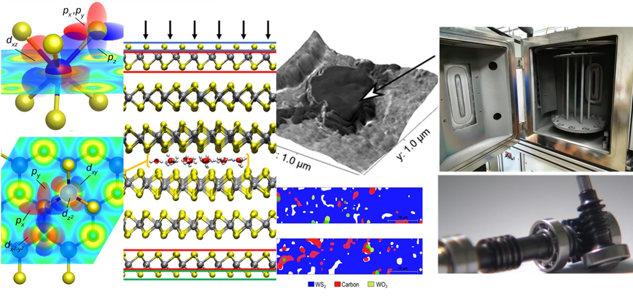 Friction and wear phenomena were analyzed on different scales. An atomic force microscope (AFM) was used to validate and/or support simulations, such as sliding the nanoscale flakes of 2D TMD materials on various substrates. Moreover, we deposited a thin sputtered layer directly on the top of AFM tip and could, for the first time, observe the structural transformation in situ. For macroscale tribology we used a combination of standard tribometers and, particularly, unique tailored devices harvesting in-situ analyses. Integrated Raman spectroscopy provided in situ assessment of coating structure during the sliding test, vacuum tribometer was used to measure ultra-low friction in a vacuum, and newly built tribometer inside the 3D profilometer measured actual wear rate of thin solid lubricant films with unprecedented precision.