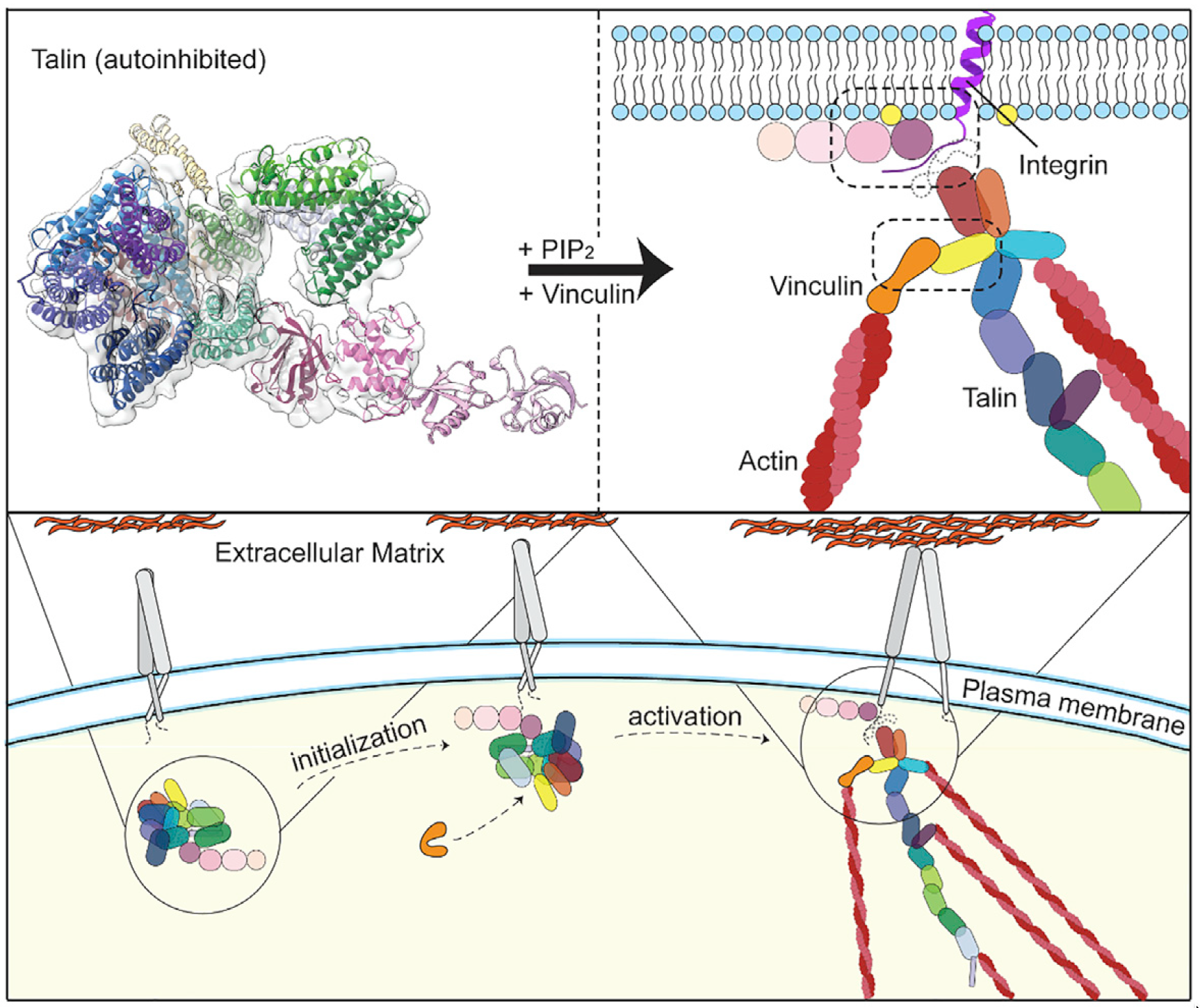 We have put extensive efforts in characterizing the master regulator talin. It is critical to understand the regulation of talin, as it is 1) an integrin activator, initiating the adhesion process 2) tension sensor, sensing the tension given by the stretching of cells and 3) platform for binding of more than 10 signaling protein components, directly connecting between membrane surface and actomyosin cytoskeleton. Talin is a large protein with 270 kDa in size. We are the first group that purified this large protein recombinantly, and this facilitated us to biophysically characterize them. By changing the surrounding ionic strength, we successfully activated the protein, changing the size from 15 nm to 80 nm by untangling its string-like folding. The biochemical analysis facilitated for the optimization of talin to be structurally stabilized for cryo-EM analysis. We obtained the structure of talin in autoinhibited form, which is now published to Cell (Dedden et al., 2019). Understanding the structure of talin and its activation machinery to a molecular level moved us forward, and we moved forward and tested the protein interactions of talin and vinculin, in the presence of membrane as well as cytoskeleton components actin. We found that the activation of talin occurs in the presence of PIP2 enriched membrane surface and vinculin is only recruited to the site and get activated in the presence of both talin and PIP2-rich membrane. Finally the complex formation of talin-vinculin at the membrane is necessary for the recruitment of actin cytoskeleton to the inner lumen of the membrane. This part of study is recently published in Elife (Kelley et al., 2020).