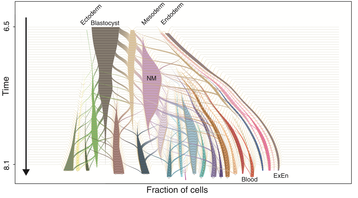 4. Since single cells are always functioning in the context of tissues and within ensembles of thousands of other cells, we develop strategies for understanding dynamics of groups of cells. This was first used to link variation of transcriptional states in single cell populations and the emergent properties of cancer cell populations, in particular given epigenetic deterioration (Meir et al 2020). Even more ambitiously, we developed models describing embryonic development as the collective dynamics of cells over a metacell model (Mittnenzweig et al. 2021). Our new “differentiation flow” models became the basis for all our work on embryonic development.