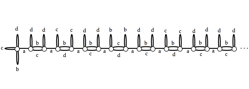 A figure below shows the Schreier graph of the Grigorchuks group, a labelled graph with an interesting self-similar behaviour for its labelling.