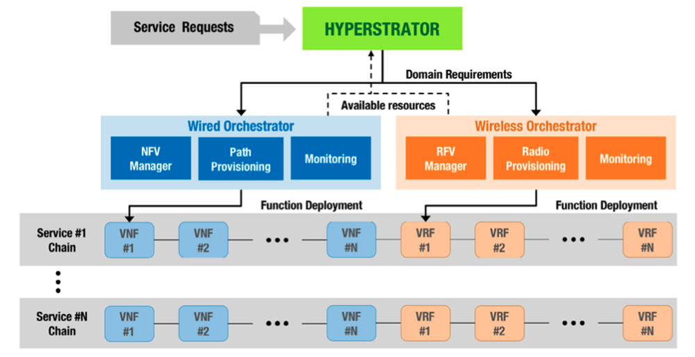 The ORCA vision regarding orchestrating next-generation services through end-to-end network slicing. This vision is core of ORCA’s showcase 3, it is the first work to combine SDR, SDN and NFV, and it is also the first effort we know to put orchestrators of network segments side by side to allow distributed per segment resource allocation/optimization. We believe this contribution can influence the future standardization to some extent.