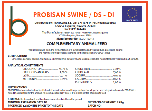 Its presentation and registration is in accordance with the current Regulation (EU) No. 68/2013 of the commission of January 16, 2013 on the catalog of raw materials for animal feed, in Glossary of treatments, point 28, where it details that fermented feed is the procedure in which microorganisms such as bacteria, fungi or yeasts are produced or used to act on the materials in order to promote a change in their composition / chemical properties.
