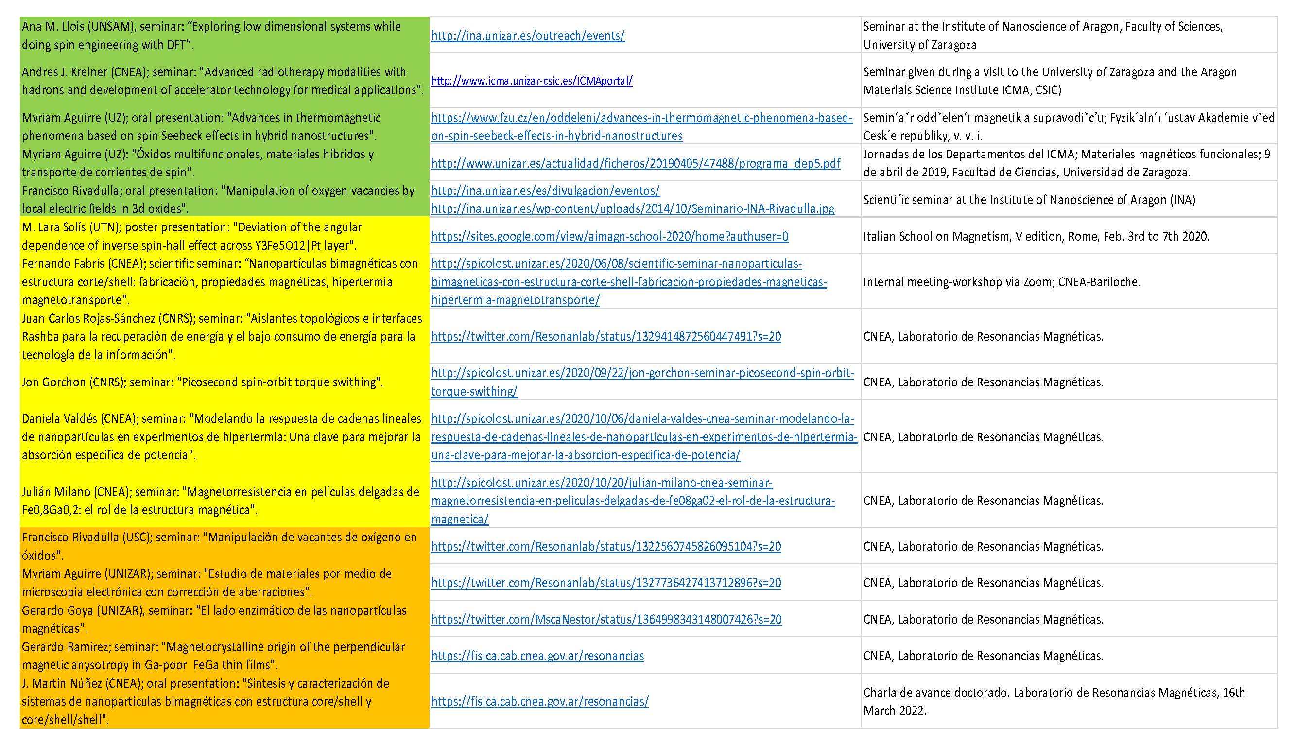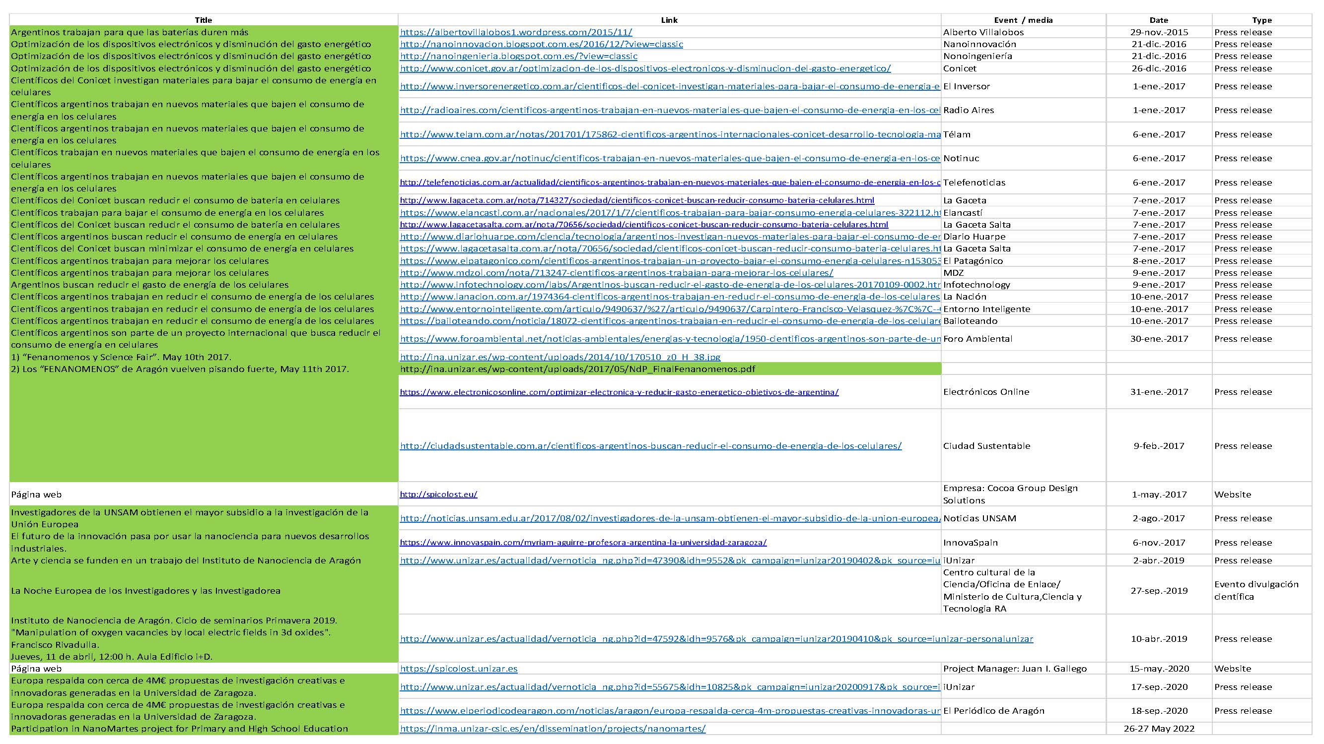 WP5: It was celebrated two Bilateral Memorandum of Understanding between UNSAM and UNIZAR for co-supervising PhD thesis and CNEA (Univ.Cuyo)-UNIZAR. One General Academic Memorandum of Understanding signed between UNIZAR and UNSAM. 4 Workshops organized Dissemination was widely fulfilled with several participations in the media (radio, TV, YouTube, newspapers) general press release: 27; trainings (3 technicians, 4 PhD and 4 postdocs). Our scientific production was portrayed by 43 scientific publications, inclusive one BACK COVER PAGE The Royal Society of Chemistry 2018. DOI: 10.1039/c8nr07834c ; 2 organizations/participation in schools; 16 Seminars participation; 26 participations in conferences. A detail of dissemination is included as a table in Images attached to the Summary for publication.