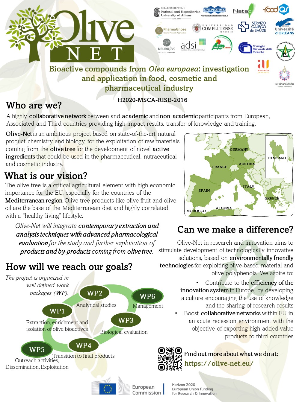 Olive-Net is an ambitious project based on state-of-the-art natural product chemistry and biology, in order to exploit diverse raw materials coming from the olive tree for the development of novel active ingredients that could be used in the pharmaceutical, nutraceutical and cosmetic industry.