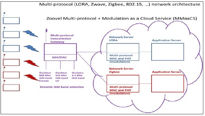 This patent protects our innovation on the field of virtualising and delocalising all necessary modulations / demodulations needed to provide services associated to OSI layers 1 (physical) and 2 (data-link). This innovation allows us to generate pre-modulated audio (or wireless radio messages) from remote elements of our ICT infrastructure, greatly reducing costs (most simple hardware at the endpoints, as they do not need to modulate the signal), efficiency (favouring a cloud-based management of different venues). Taking advantage of this innovation, we can store different pre-modulated signals for different radio technologies and delay the decision on the final transmission medium to use (e.g. different radio technologies are deployed but some may become unavailable by a natural or a human-induced disaster).