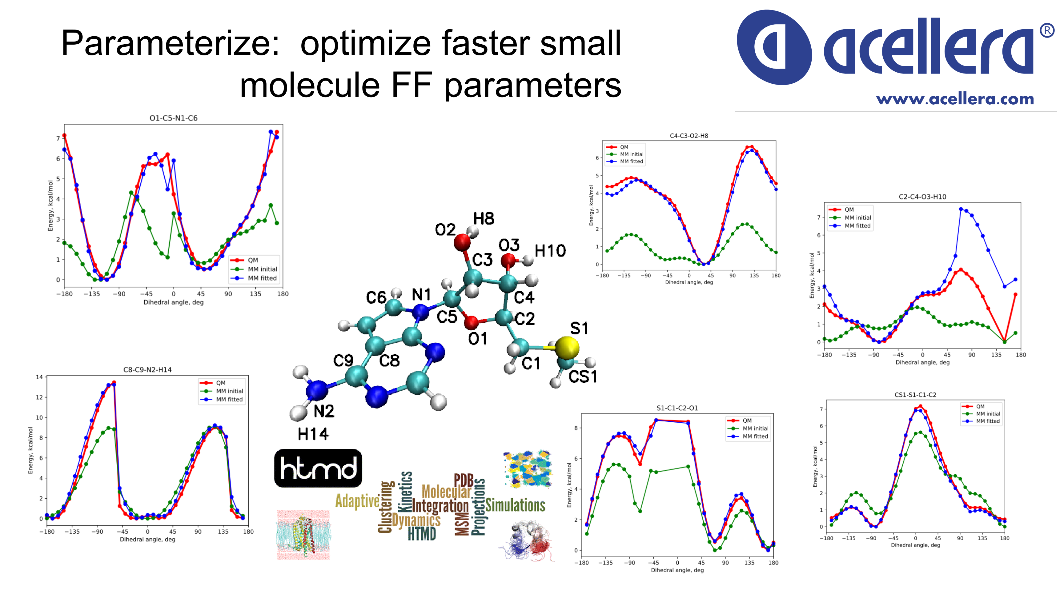 As a next step, the associate developed a visual and user-friendly web-application to facilitate the execution of the protocols. This application, called parameterize, answers a critical issue when performing HTMD simulations. It automatizes the process of the key parameter fitting (i.e. atomic partial charges and dihedral angle parameters) from quantum mechanic data. Also, a set of molecules was benchmarked on the application, which represented typical fragments and drug-like molecules used in drug discovery.