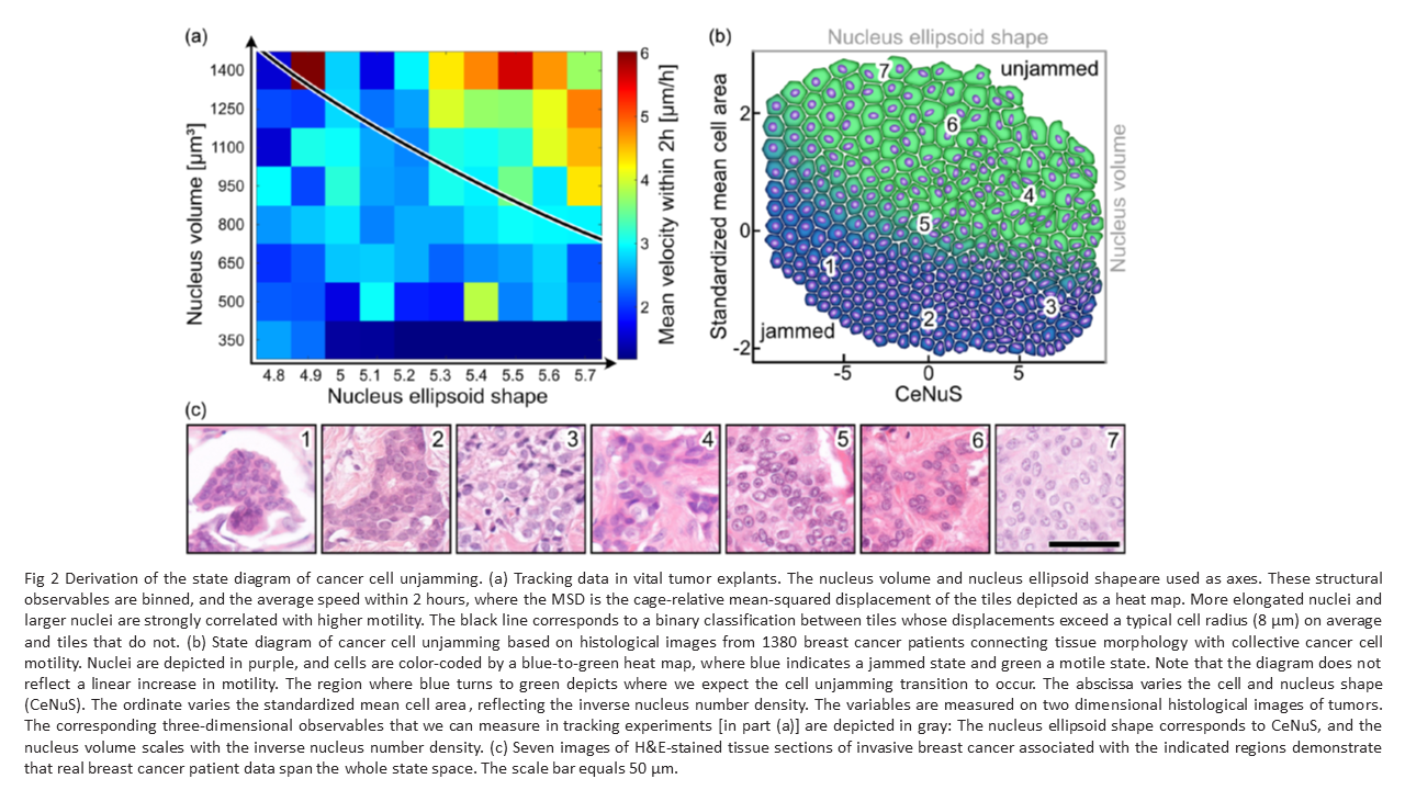 Cancer research concentrates on the molecular properties of individual cells, which has revolutionized our understanding of cancer and provided overwhelming details. The reductionist approach of Physics of Cancer does not reach the same depth in detail, yet it leads to quantitative measures and provides understanding on an emergent level, which cannot be described by bottom up approaches such a molecular description. To complement the available molecular information, the project focuses on the collective behavior of cancer cells and answers the question: When is a cancer cell jammed or when can it overcome the yield stress to actively “flow” in a dense microenvironment? The PI has brought forward the basic idea within the concept of Physics of Cancer that changes in a cancer cell’s and/or a tumor tissue’s mechanical properties determine its metastatic potential. The project has achieved a breakthrough in the Physics of Cancer by determining the role of cancer cell unjamming in the metastatic cascade and by deriving a predictive diagram to mark the conditions for unjamming transitions of cancer cells (see Fig 1). I have been able to prove that cell unjamming occurs in breast and cervix tumors. It is new type of unjamming transition that differs from jamming in inanimate soft matter. I have generated a state diagram that determines as a function of shape (cell and nucleus shape (CeNuS)) and nucleus spacing whether a cellular tissue is collectively jammed or motile. This is the basis of my new prognostic criteria for distant metastatic risk. The diagram solves open questions concerning the cell unjamming process. The contribution of the cell nucleus has been previously unknown. The diagram reconciles the controversial roles of shape and packing by combining them in the state diagram. Within a solid tumor the cancer cell clusters embedded in stroma show solid, areas of jammed cells surrounded by fluid regions of motile cancer cells forming a heterogeneous solid that combines mechanical stability with a maximum of cancer cell motility. Cancer cell unjamming fosters cell escape from the primary tumor and is thus an early event of the metastatic cascade. In a retrospective clinical trial with 1380 breast cancer patients I have shown that cancer cell unjamming is the basis of a new prognostic index for distant metastatic risk, which complements the lymph node status, the current gold standard for metastatic risk, and thus will avoid over and under treatment of patients. My prognostic index is “agnostic” to molecular details of different tumor entities. Thus, we can address approx. 92% of all cancer types.