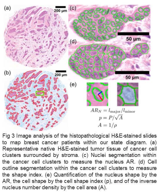 In Grosser et al, Physical Review X (2021), my lab has shown in patient derived tumor explants of cervix and breast carcinoma by vital cell tracking that in cancer cell clusters cells collectively become motile through a novel unjamming transition and fluidize the tissue. Our publication has been chosen by Nature Review Physics as one of the ten most important publications in 2021 and by Physical Review X as one of the ten most important publications of the last ten years. Based on previous findings cell unjamming was either interpreted shape or density induced (Blauth et al, Frontiers in Physics (2021)) my state diagram resolves this conflict (Fig 2). Cancer cell unjamming is based on elongated cell and nucleus shapes (CeNuS) as well as a decrease in nucleus number density. The phenomenon of cancer cell unjamming allows me to develop the first clinical cell motility marker that can be used in static images such as histological slides as illustrated in Fig 3. I have shown that the cancer cell clusters embedded in stroma within solid tumors need jammed regions of stiff cancer cells to behave like a mechanically stable solid and unjammed regions of soft, motile cells to foster motility and proliferation (Fuhs et al, Nature Physics (2022)). The cancer cell clusters assume a unique heterogeneous solid state, where the soft unjammed cells are the majority and tension percolation generates a solid behavior. Jammed and unjammed cells differ by a decrease in cell stiffness (see Fig 4). A change from cortical contractility to stress fiber based contractility plays a role in the unjamming process (Warmt et al, New J. Phys. (2021)). Other drivers of unjamming and cancer cell escape from the tumor mass are stroma density and cadherin expression (Ilina et al, Nature Cell Biol. (2020)). Cancer cell unjamming is one of the earliest events in the metastatic cascade. I have investigated the prognostic value of cancer cell unjamming for distant metastasis. Our retrospective study of histological slides from 1,380 breast cancer patients demonstrates that cancer cell unjamming is of prognostic relevance concerning distant metastasis (Gottheil et al, Physical Review X (2023)) (Fig 5). The Nottingham index is currently the gold standard in prognostic indices, relying on histopathology. It uses the invasion of nearby lymph nodes as the sole indicator of cancer cell motility. Thus, lymph node status constitutes the most important prognostic marker for distant metastases. Cancer cell unjamming distinctively complements the lymph node status. Unjamming seems to support pathways for distant metastasis that bypass the lymph nodes. Thus, jamming may help to avoid overtreatment of patients with false-positive lymph nodes and under treatment of patients with false-negative lymph nodes with regard to metastatic risk. Moreover, on a bulk level cancer cell unjamming causes an increase in tissue fluidity. In collaboration with Prof Sack’s lab at the Charité I have shown for a broad range of tumor entities that tumor progression leads to tissue fluidization, which can be used a prognostic criterion in magnetic resonance elastography (MRE) (Sauer et al, Adv. Science, in press).