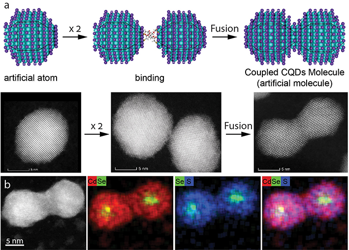 We have developed a new and robust methodology, which affords control over the parameters joining the two QDs together. Importantly, this includes also fusing the two QDs to form a coupled molecular-like system with a stable continuous crystal lattice as the connection region between the two QDs. Such a connection is robust and is also providing strong controlled coupling between the two QDs. Considering the wide selection of size and composition of controlled QDs, this opens up vast opportunities to generate different types of artificial molecules using this methodology. At the end of such a process, the surface chemistry of the free-standing artificial molecules can be controlled to enable chemical compatibility with different solvents including water as needed in bio- and medical- applications. They can be embedded in plastic sheets for display applications or printed and deposited on diverse substrates to serve as building blocks for optoelectronic devices.