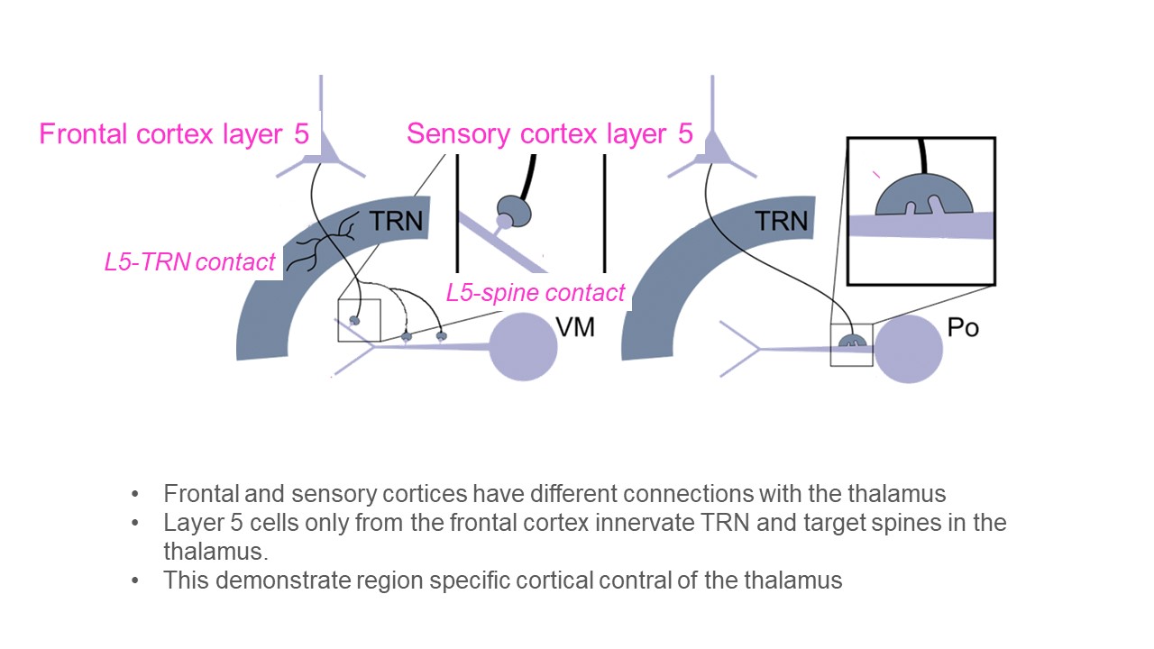 3) We have demonstrated that frontal L5 target a specialized neuronal compartment in the thalamus called spines. Properties of these structures were similar between cortex and thalamus. Since spines are the neuronal substrate of plasticity of the cortex our data point to an intriguing hypothesis that cortico-thalamic communication can display region specific plasticity and can be involved in learning and neurological alterations linked, specifically to frontal cortex.