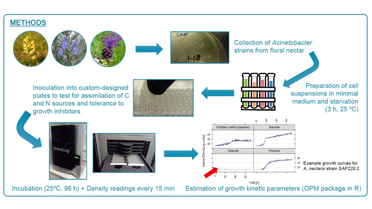 This work package involved the developed of a 96-well plate assays based on Biolog’s phenotype microarray technology to test for assimilation of carbon and nitrogen compounds (30 and 24 assays, respectively), and tolerance to different stressors commonly found in floral nectar (28 assays). Analysis of the phenotypic data obtained for the collection of 82 nectar- and insect-associated acinetobacters by such technology identified seven different profiles for carbon assimilation, 32 different profiles for nitrogen assimilation and ten different profiles for tolerance to inhibitors. Surprisingly, even when they are frequently encountered in floral nectars of high sugar concentration, tested strains could only resist moderate osmotic pressures. Moreover, clustering of strains according to their nitrogen assimilation patterns (but not to their carbon assimilation and tolerance profiles) was linked to species identity. Such clade-driven distribution suggests niche partitioning for assimilation nitrogen resources that may allow coexistence in floral nectar and other habitats.