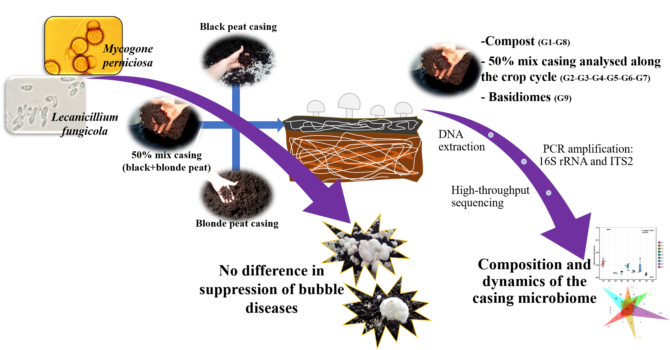 2) The composition of the microbiome of the 50:50 casing mixture along the crop cycle, compost and basidiomes, was evaluated through next generation sequencing (NGS) of the V3-V4 region of the bacterial 16S rRNA gene, and the fungal, ITS2 region. The naturally established casing microbiota could help to suppress disease development when inoculum levels were low, but was not effective in suppressing a high pressure of artificially introduced fungal inoculum. Determination of the composition of the casing microbiome paves the way for the development of synthetic casing communities that can be used to investigate the role of specific components of the casing microbiota in mushroom production and disease control.