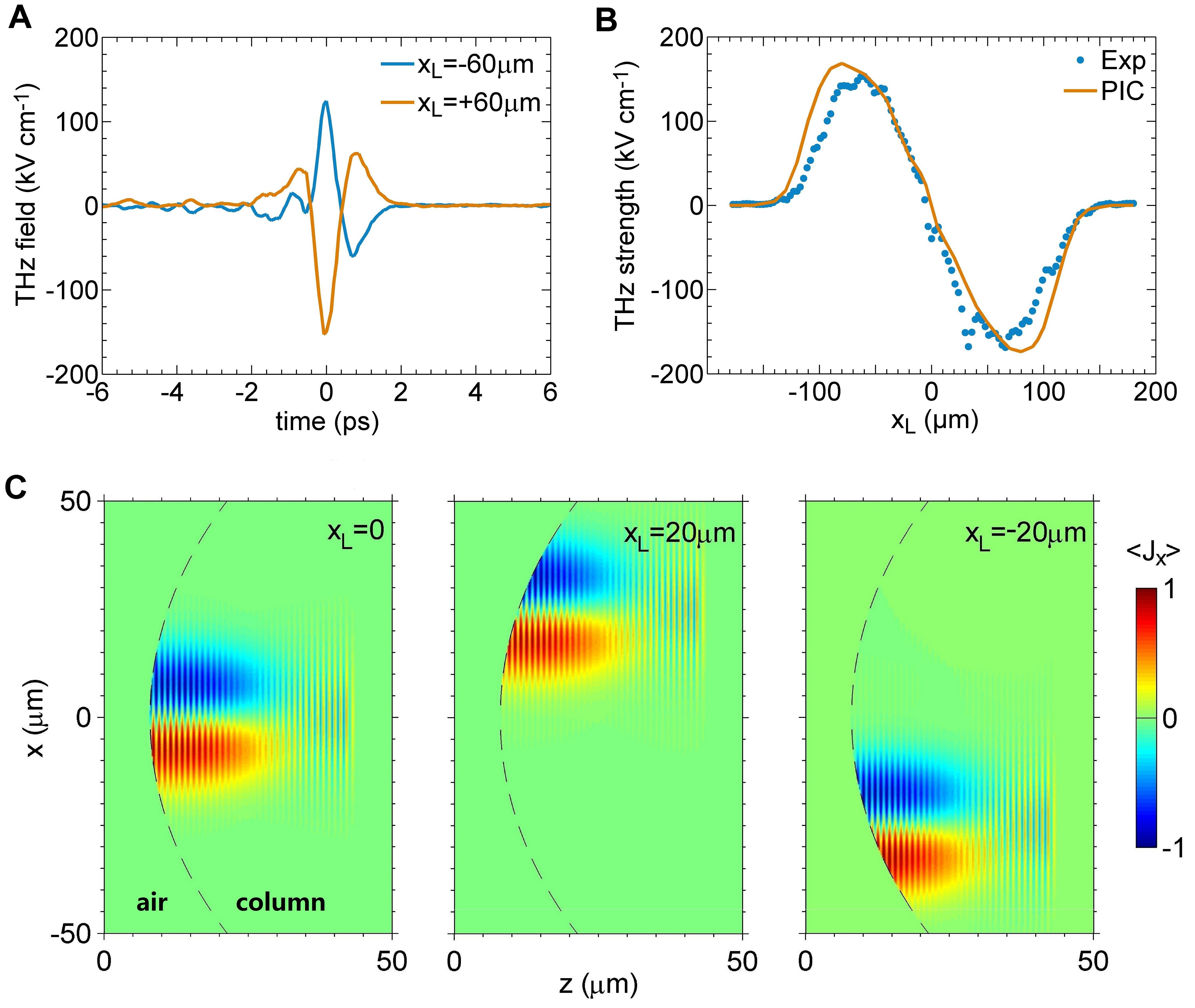 Novel Terahertz-ray sources. We found strong liquid terahertz (THz) sources, which could be more easily to apply than the well-known two-color air THz source, which has been studied most broadly. Our scheme provides the possibility of achieving a THz yield as high as that of a typical the two-color laser air THz source (as high as 0.01%), yet via a single-color laser driven in our scheme. Indeed, this scheme could result in a more compact solution due to absence of the relatively long focal length necessary to give rise to long plasma filaments. In addition, our work reports on a timely and very interesting topic, i.e. the THz generation from a liquid state source. THz pulse generation from water film was observed first very recently in 2017. In this work, we reported on their observation of THz pulse generation in water column having sub-mm diameter. We thoroughly investigated this phenomenon experimentally and explained it by and theoretic model and the results of PIC simulations.
