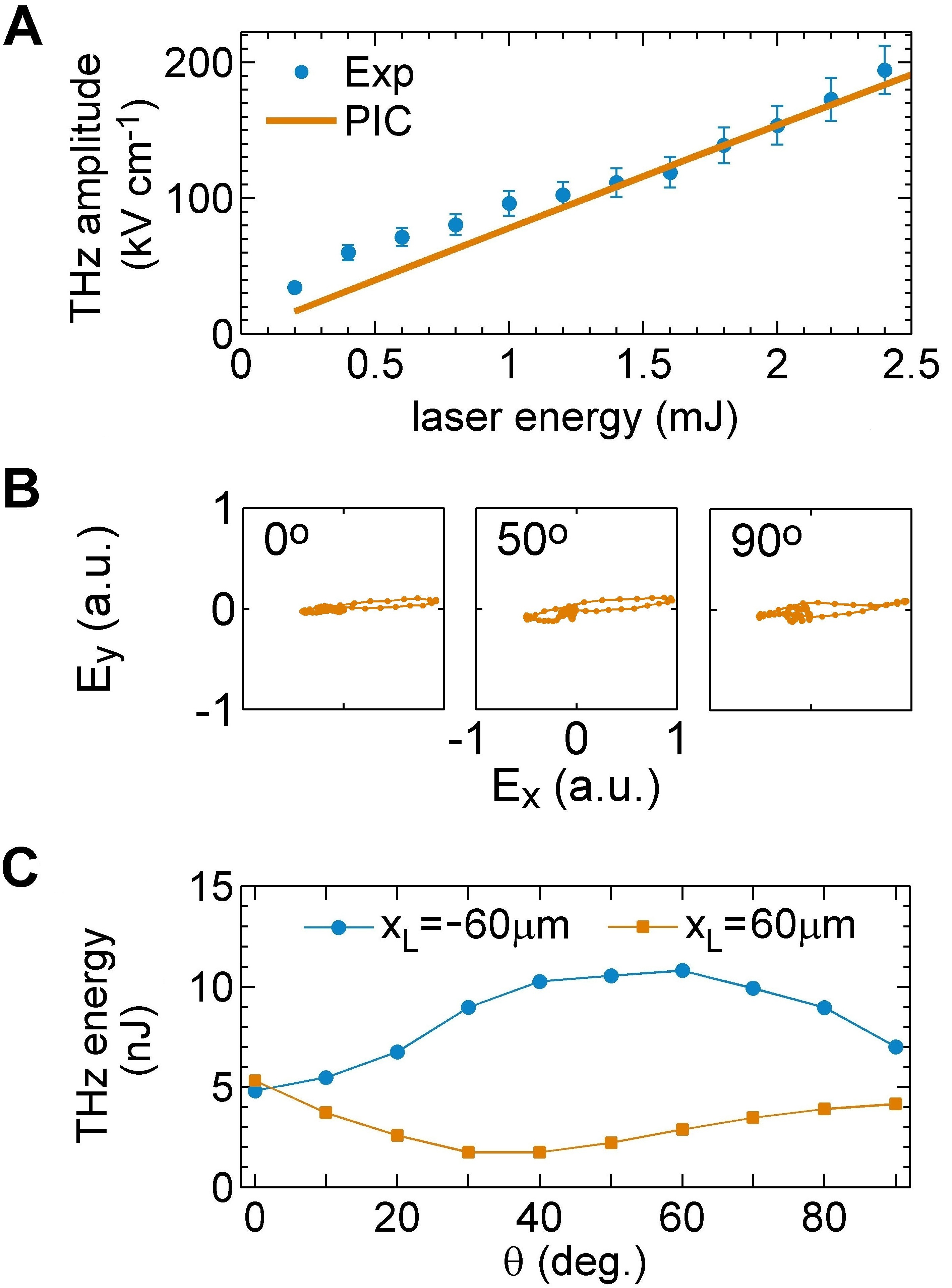 4) Achieving table-top terahertz (THz) sources with high field strength and broad bandwidth is an outstanding issue in THz science. Such sources can find applications in material research, biomedical imaging, non-destructive detectio, and THz-field interaction with matter. Previous studies have demonstrated THz generation from solids and gases via different mechanisms. However, THz generation from liquid, in