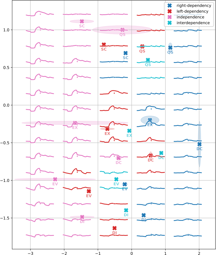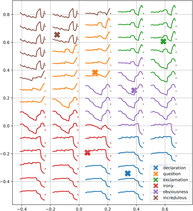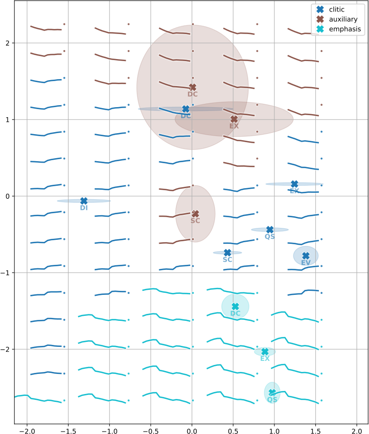 Thanks to this, the VPM can capture and reveal variation in prosodic structure within the imposed constraints of the modelling framework. Specifically, the VPM can map out a prosodic latent space representation of the prosodic variety manifold at different linguistic levels of organisation. An example of this structure is shown in the attached figures for a prosodic latent space captured at three levels of the linguistic hierarchy: the phrase level, the syntax level and the word level. This representation gives us an insight of the prototype shape distribution within the corresponding three levels of prosodic encoding.