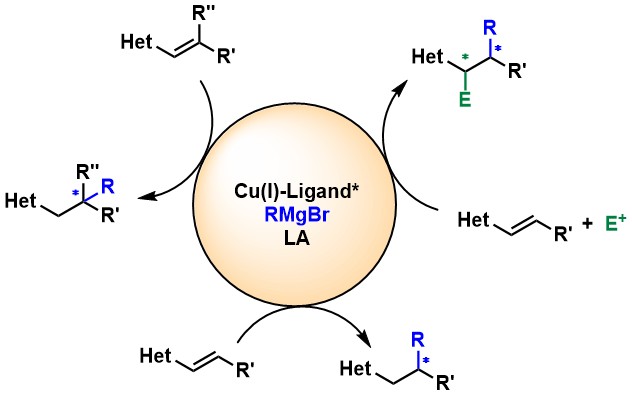We continue the project with the generation of contiguous stereocenters next to the heterocyclic moieties by sequential asymmetric addition/Mg-aza-enolate trapping reaction. We developed a study on sequential conjugate addition of Grignard reagents to alkenyl-heteroarenes followed by trapping of the resulting enolates, yielding moderate to good diastereoselectivities. Contrary to conventional wisdom, one-pot conjugate addition/trapping using two reactive Michael acceptors in combination with Grignard reagents can proceed via conjugate addition to the least reactive Michael acceptor. This unusual chemoselectivity is triggered by the presence of a Lewis acid, reverting the usual reactivity order of Michael acceptors. We decided to go one step forward using carbenium ions, different Michael acceptors and bromine as electrophiles in the Lewis acid promotion of the enantioselective conjugate addition (CA) of Grignard reagents to unsaturated amides, carboxylic acids and alkenyl heterocycles. During this work we show a simple one-pot conjugate addition-trapping protocol that leads to functionalized molecules starting from unreactive Michael acceptors. This domino reaction of enamides with carbenium ions afforded compounds featuring useful and non-trivial substituent motives.