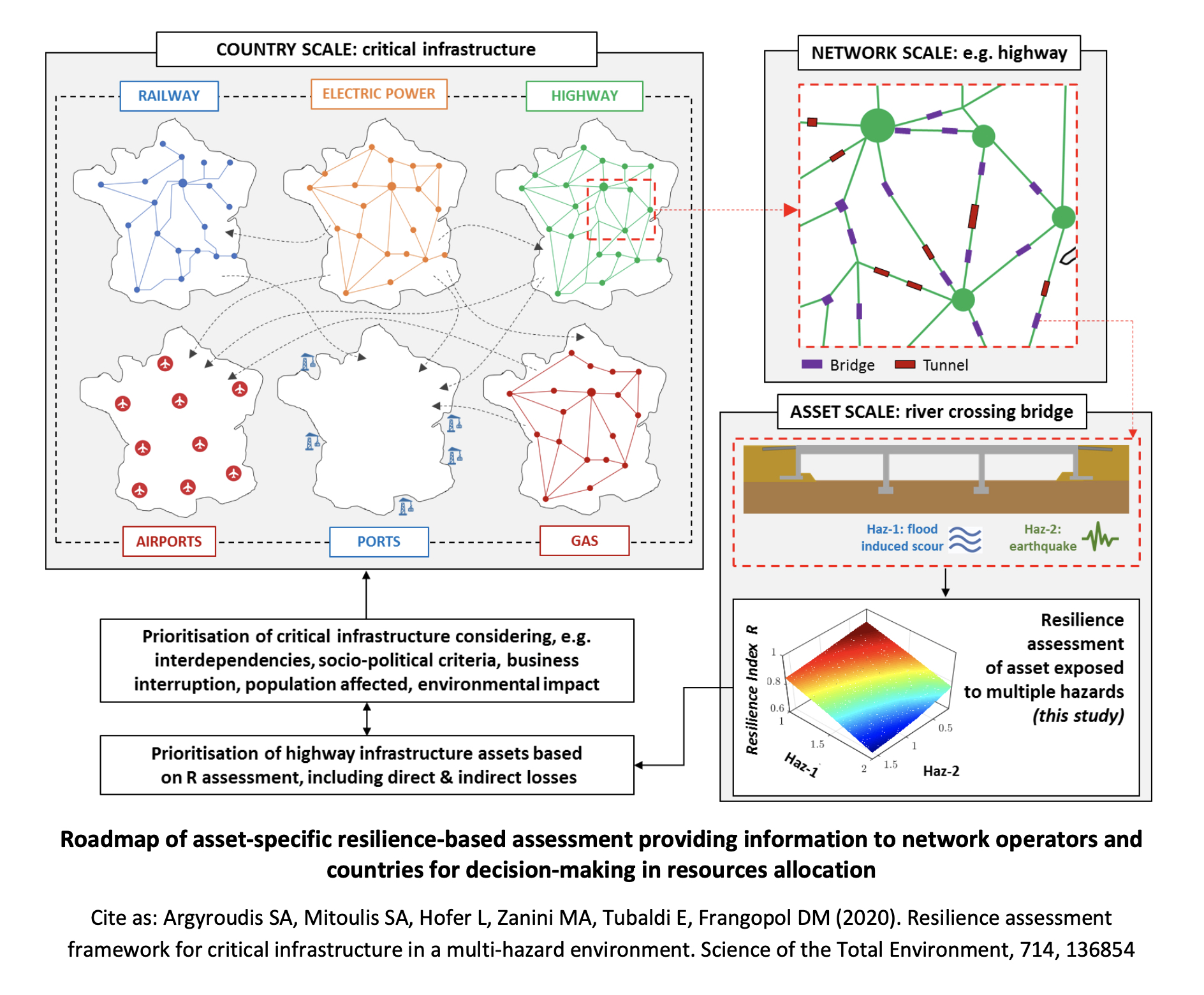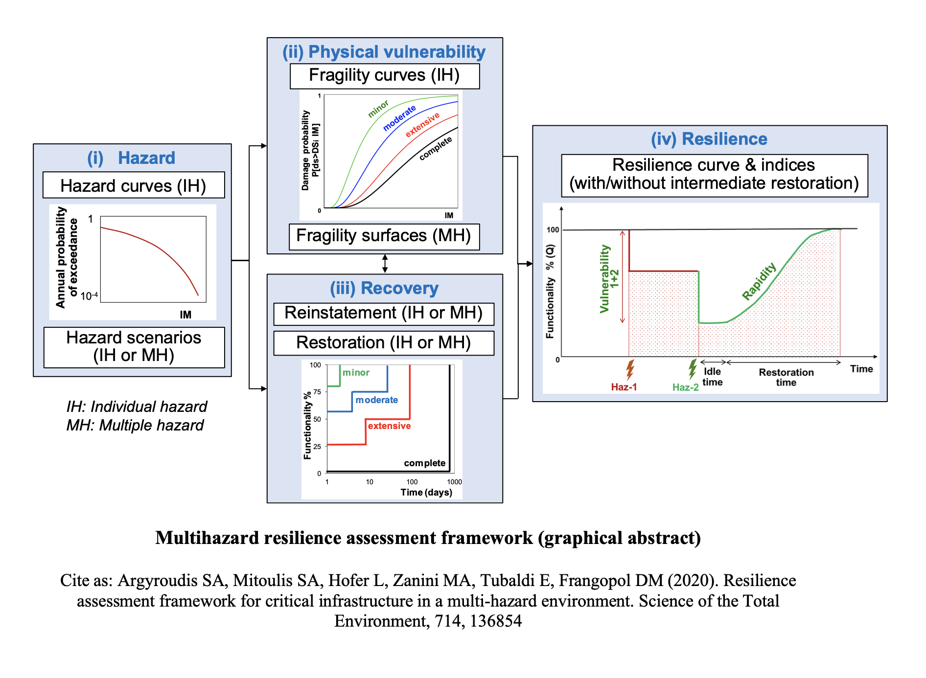 WP4: A classification of multiple hazard sequences considering their nature and impacts was proposed. A novel framework and indices for the quantitative resilience assessment of critical infrastructure, subjected to multiple hazards were proposed, considering the vulnerability of the assets to hazard actions, and the rapidity of the recovery, including the temporal variability of the hazards. New restoration models have been proposed for damaged bridges using expert elicitation approaches. The proposed framework was applied on a typical highway bridge. This research included collaboration with Prof D Frangopol (Lehigh University) and other researchers from University of Padova (Italy) and Strathclyde University (UK).