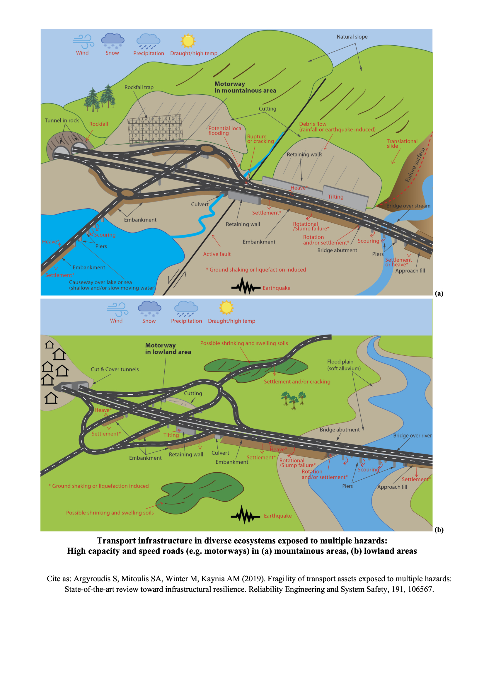 - Delivered a primer in resilience engineering by establishing a novel resilience assessment framework for transport infrastructure that accounts for the nature of the hazards, including projections for exacerbation of effects due to climate change, their sequence, the loss of functionality, the recovery strategies and their rapidity and associated losses.