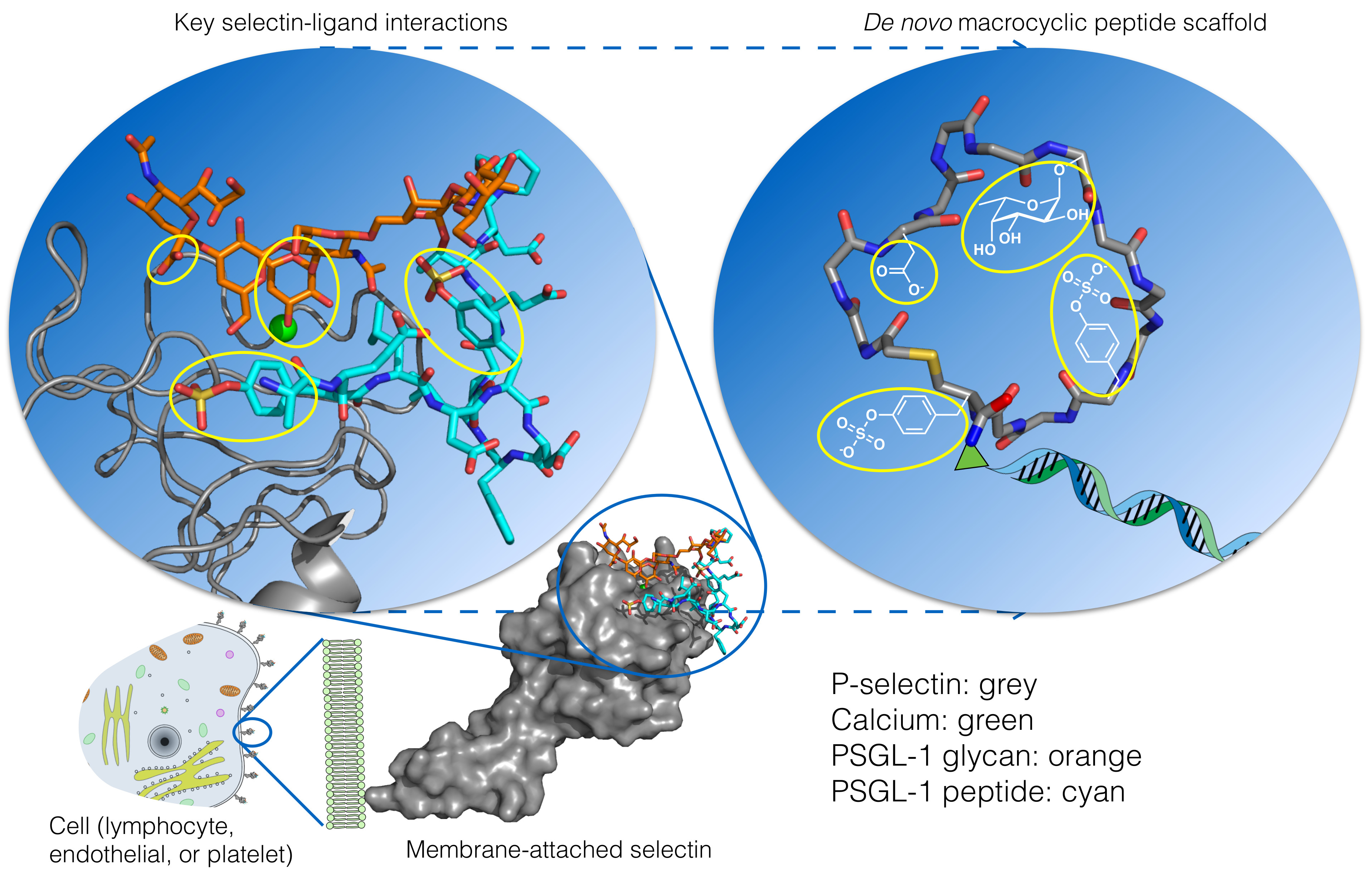 Our objectives were to find molecules that could bind strongly and selectively to each of the three selectins. To achieve this, we modified a system for generating tens of billions of different compounds at a time, with DNA used as a barcode to allow identification of which of these many different molecules can bind to the selectin. This required us to develop some new chemical tools to allow this pool of molecules to better resemble the glycans that selectins normally bind to, improving our chances of success. We also aimed to use this vast pool of different molecules to look for patterns of binding that might teach us more about how selectins work.