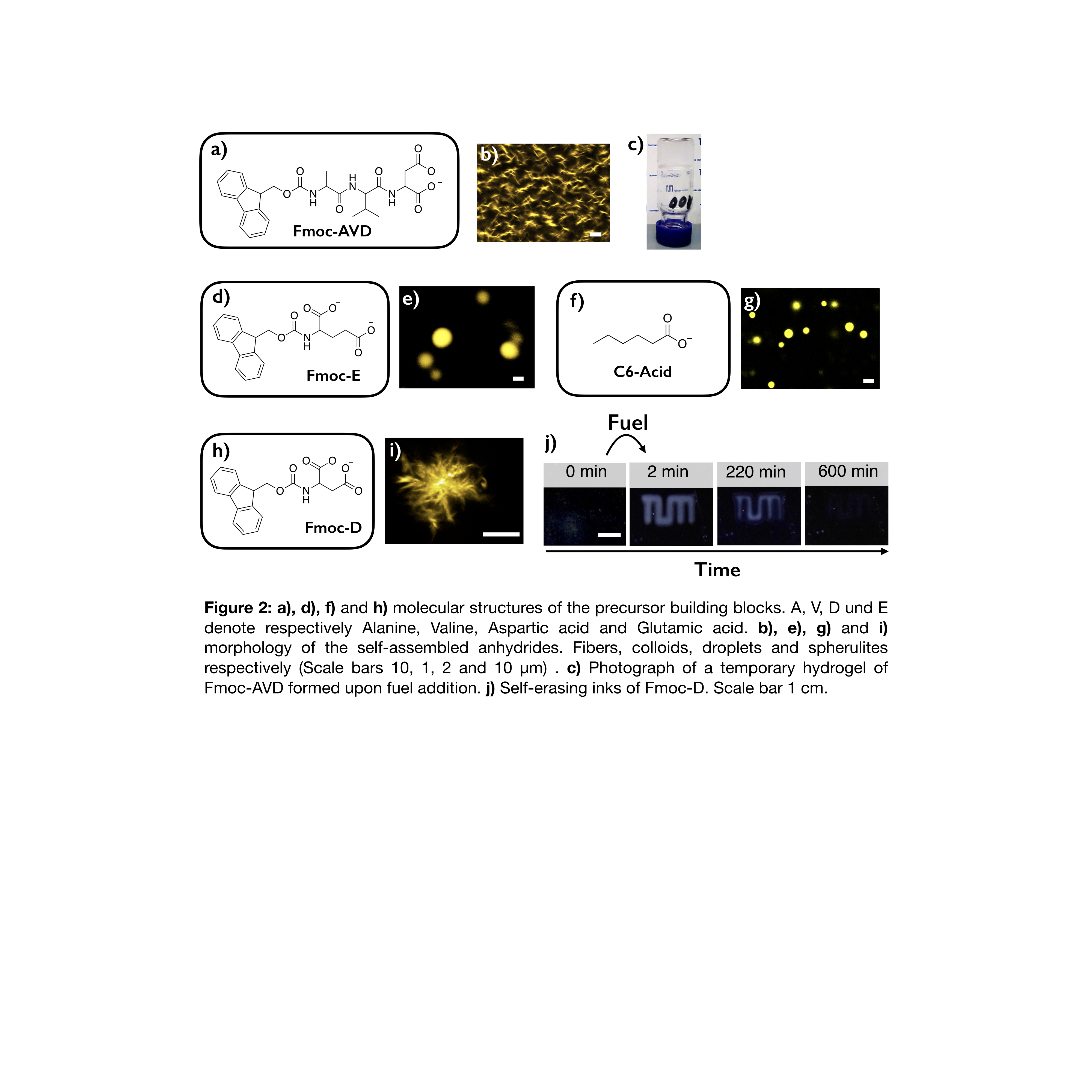 Due to the versatility of the chemical reaction network, other different fuels and precursor building blocks were explored therefore developing other types of dissipative materials (Figure 2). Particularly interesting were the formation of temporary colloids upon self-assembly and their application for the sequentially release of hydrophobic agents and the formation of spherulites and their use for temporary inks. The applications of all these materials were possible due to the dissipative nature of the system. Most likely such applications could not be achieved by using the classical thermodynamic materials developed so far.