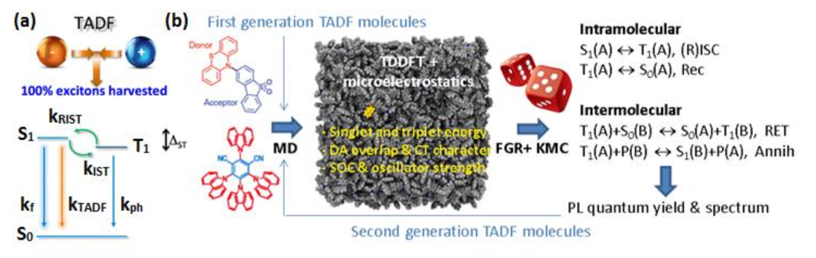 Furthermore, we focused on the impact of the environment on the performance of OLED devices. In collaboration with the experimental group of Prof. R. Friend at the University of Cambridge, we developed a detailed understanding of the time evolution of singlet and triplet states in a film and solution for TXO-TPA emitter. Here, with the help of an explicit QM/MM model, we outlined the role of solvent polarization, which activates certain structural reorganizations (absent in a film) with a large impact on the efficiency of the intersystem-crossing processes. We also investigated further effects of the medium that interfere with the intersystem-crossing process, such as exciton-spin interaction and triplet-triplet annihilation, TTA (as well as the down-conversion as a counterpart of TTA). Regarding the former, we proposed a mechanism that explains the optical activation of triplet states in organic molecules by Yb-doped lanthanide nanoparticles, showing that the process involves a double spin-exchange process with the quantum dot. These findings triggered various experimental efforts and the efficient transfer of photogenerated triplets between the molecules and the inorganic shell or even up-conversion was demonstrated experimentally. In the case of TADF-based OLED, the coupling of the emitter to a spin-containing nanoparticle resulted in the increase of ISC rate by three orders of magnitude. Note that although a similar working principle is utilized in e.g. phthalocyanine copper complexes, the effect is usually attributed to a large induced spin-orbit coupling. Here, we have shown that it rather originates from the presence of the non-zero spin, converting the molecular singlet and triplet states into the same (doublet) spin-manifold, in contrast to a common believe.