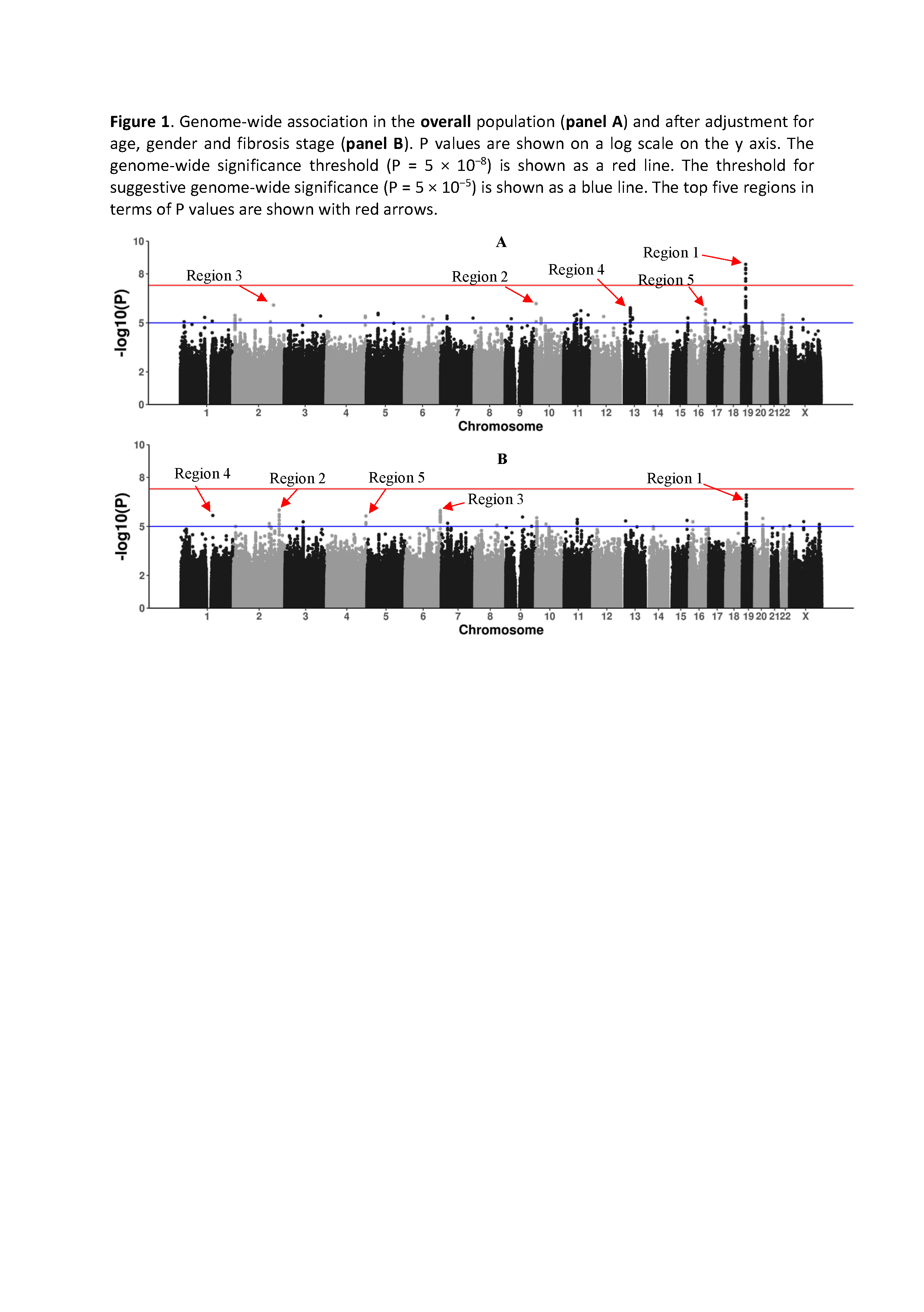 Our analyses performed with and without adjustment for clinical factors (e.g. age, gender) allowed us to identify several genomic regions associated with HCC (Figure 1).