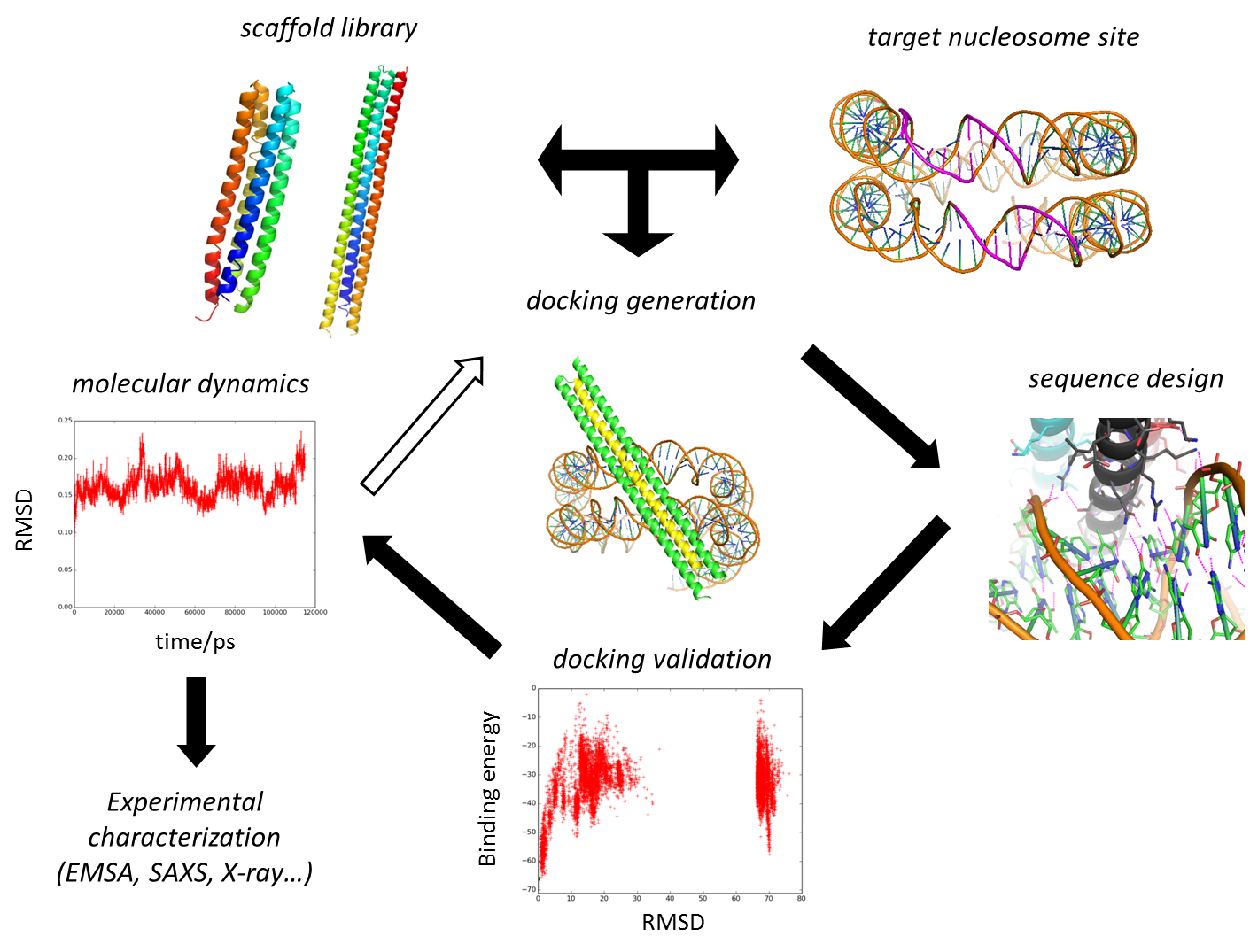 DesProtDNA comprised three objectives. First, development of a general computational method to de novo design protein-DNA binding interfaces in the nucleosome with specificity. Second, experimentally validate the method by testing proteins designed to target a nucleosome with high-resolution structure available. Third, use the method to design proteins binding specific nucleosomal DNA sites involved in diseases. Additionally, the project aims to provide the researcher with new computational and experimental skills to implement new protein-DNA design schemes and validate them.