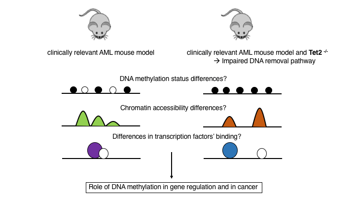 TET2 is one of the most-frequently mutated genes in AML (12-32%) and other haematopoietic disorders. It catalyses removal of DNA methylation mark. Several studies have shown that loss of TET2 function impedes the normal haematopoietic program and promotes self-renewal. Enhancers are specialized DNA regions that are bound by transcription factors that remotely target genes. Active enhancers do not usually have DNA methylation, suggesting that demethylation can be crucial for their function. However, the mechanism of how TET2 influences enhancers’ function is not known. Thus, the goal of my proposal is to investigate aberrant DNA methylation on enhancers in malignant haematopoiesis and to explore its functional role. To attain it, I have set the following objectives: 1) Identification and functional validation of methylation-sensitive enhancers; 2) Identification and characterization of methylation-sensitive transcription factors involved in stem cell self-renewal in leukaemogenesis.