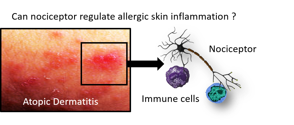 Atopic dermatitis (AD) also known as eczema is a chronic itch inflammatory skin disease that affects one in ten people. Moderate-to severe AD may have a strong impact on health-related quality of life, especially due to itch burden. AD is frequently associated with atopic comorbidities such as asthma and allergic rhinitis. The etiology of AD is incompletely understood, but many factors (i.e. complex interactions between environmental and genetic factors, involvement of various types of immune or structural cells and multiple signaling pathways) are thought to contribute to the development of skin lesions in AD. There are accumulating evidences showing that cutaneous sensory neurons play a critical role in such diseases. This project aims to investigate a potential new therapeutic target in the prevention and treatment of allergic skin inflammation: the interactions between specific nociceptors (nerves that sense damaging stimuli by sending signals to the spinal cord and brain) and type 2 immunity.