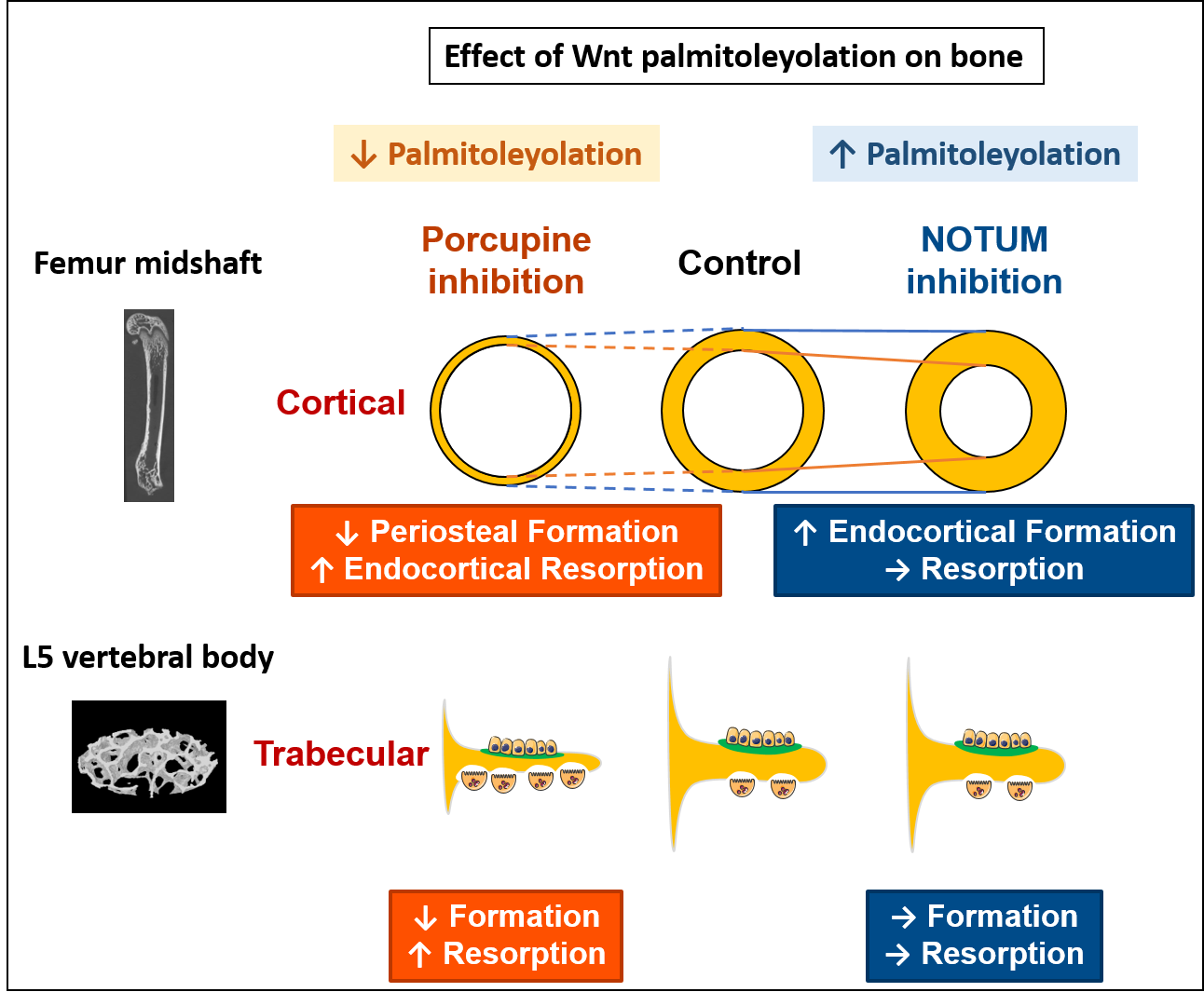 During this first part of the scientific project, we focused on the role of palmitolyeolation of WNTs by Porcupine on bone density and bone strength. Using a murine pharmacological approach, we inhibited either Porcupine (that adds palmitoleate to WNTs) or NOTUM (that removes palmitoleate from WNTs). We found that Porcupine inhibitors, currently in Phase I trials for cancer therapy, dramatically reduced bone density and bone strength. Both cortical and trabecular bone was affected due to a decrease in bone formation and an increase in bone resorption. On the other hand, NOTUM inhibition increased cortical bone mass and strength, mainly by enhancing endocortical bone formation. Altogether, these results demonstrate that palmitolyeolation of WNTs is a key factor for the site-specific regulation of bone mass and strength. This mechanism could be further tested as pharmacologic targets for the prevention of osteoporosis, or as biomarkers to identify patients at risk of fractures.