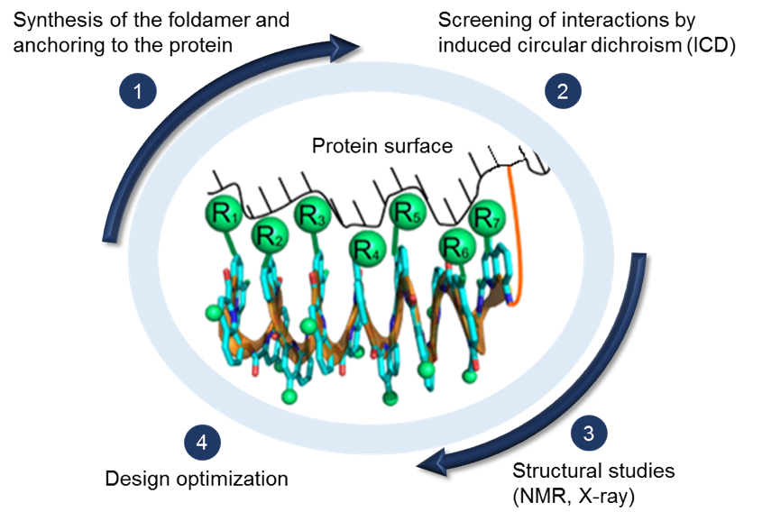 The methodology achieved the following objectives: a) synthesis of a library of foldamer sequences of different length containing various proteinogenic side chains, and anchoring them to protein surfaces; b) screening of the protein-foldamer interactions by induced circular dichroism (ICD); c) assessing the structural information either by solid state structures (X-ray crystallography) or by solution NMR studies; d) new design optimization based on the structural information.