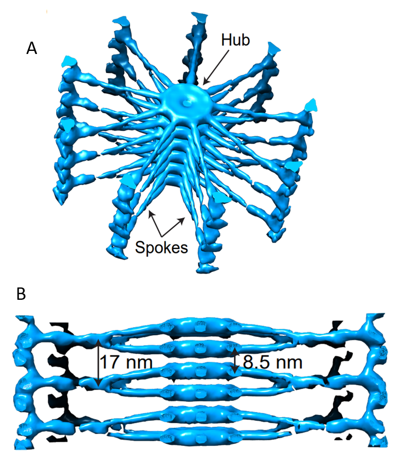 The centriole architecture is conserved and comprises cylinders typically ~500 nm long and ~250 nm in diameter with characteristic 9-fold radial symmetry. Structurally, the best-studied region of centrioles is the cartwheel, which is the first region forming during centriole biogenesis. The cartwheel consists of a circular hub from which nine spokes emanate. Recently, the protein SAS-6, which is essential for normal centriole assembly was shown to form cartwheels in vitro in the absence of other components. Cartwheel layers stack with ~8.5 nm periodicity at their central hubs, while spokes from successive layers merge in pairs to give ~17 nm periodicity at the cartwheel periphery (Fig 1). Importantly, stacking of cartwheel layers is not maintained through direct interactions of the central hubs, which do not connect to one another, but by peripheral associations that ensure correct spacing (Fig 2). Despite the importance of centriolar structure which is directly linked to organelle function and organism health our understanding of this system remains limited. In this proposal we combined multidisciplinary approaches in an effort to address important biological questions: