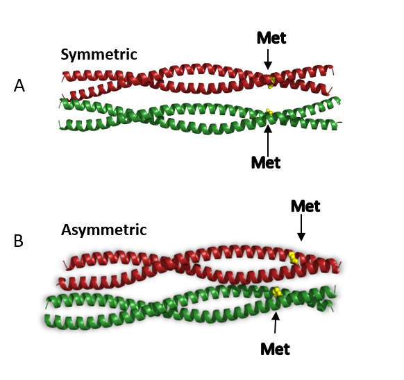 segment (25% identity between human and Chlamydomonas), which makes transferring amino acid level information for functional assays across systems difficult. Thus, to understand the molecular basis of cartwheel polarity in vertebrate centrioles we first need to resolve the structure of the underlying asymmetric SAS-6 interaction. We have obtained 2.6 Å resolution diffracting crystals from the human SAS-6 (hSAS-6) coiled coil domain and 2.3 Å resolution diffracting crystals from the zebrafish SAS-6 coiled coil (67% identical to the human). Analysis of crystallographic parameters suggests the asymmetric units of both crystals contain two coiled-coil dimers, and an interaction between SAS-6 coiled-coils has been corroborated by SEC-MALS. We will resolve the structures of these SAS-6 coiled-coil arrangements to understand the basis of SAS-6 oligomer asymmetry, and engineer mutations that specifically disrupt this interaction as performed previously.