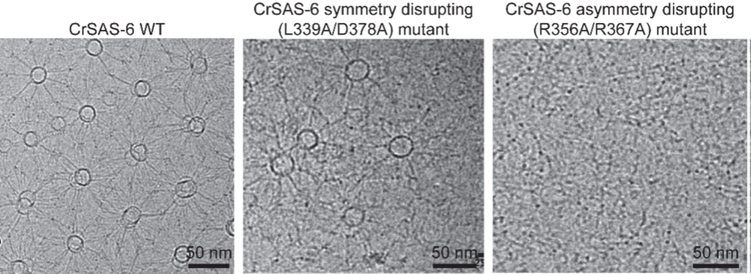 the two SAS-6 coiled coils have a ~1 nm linear offset (Fig. 3B). Crucially, the difference between these two arrangements holds a fundamental implication for cartwheel structure, as an asymmetric SAS-6 interaction could give rise to asymmetric (polar) SAS-6 ring dimers, which in turn would build polar cartwheels To assess which of the two interaction arrangements of SAS-6 coiled coils is found in cartwheels, we tested the ability of SAS-6 mutants that selectively disrupt the symmetric or asymmetric arrangement to form cartwheels in vitro. As seen in Fig. 4, SAS-6 mutants that disrupt the symmetric coiled coil arrangement form cartwheels similar to the wild-type (WT) protein, whereas mutations disrupting the asymmetric arrangement abrogate cartwheel formation. Thus, our results demonstrate that an asymmetric SAS-6 interaction is essential for cartwheel formation.