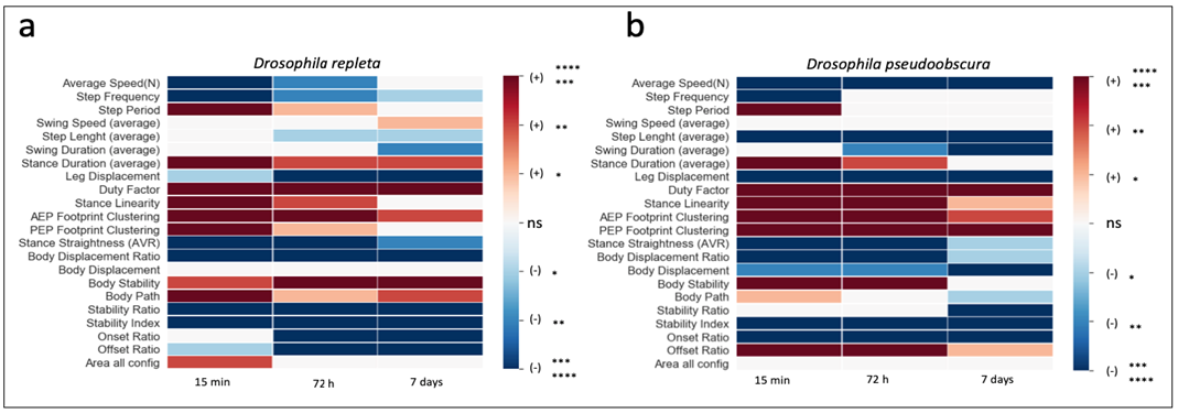 Overall, the data regarding amputated walking behavior on Drosophila pseudoobscura and repleta strongly suggest that these, like their Canton-S Drosophila melanogaster counterpart, can efficiently deal with the amputation of both middle legs, doing so by adapting various locomotor parameters which grants them the ability to walk using only four legs.