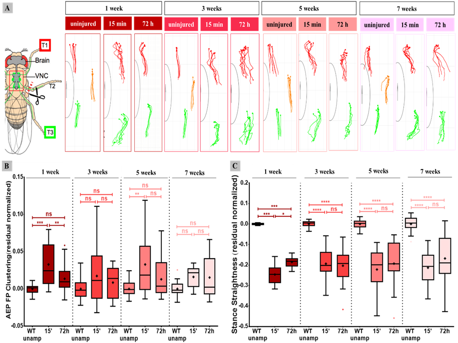 After the positive results of locomotor adaptation that occur post middle-leg amputation in various Drosophila melanogaster wild type lines including Canton-S, we sought to test if this phenotype was reproducible in the evolutionarily distant Drosophila species Drosophila pseudoobscura and Drosophila repleta. With this experiment, we aimed to understand whether there is any evolutionary conservation of our behavioral readout, which, in case of a positive result, adds robustness of our genetic model for neurorehabilitation.