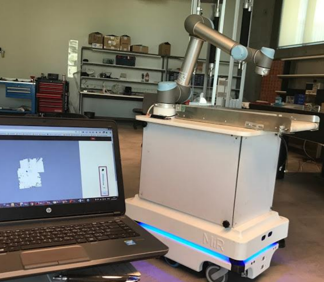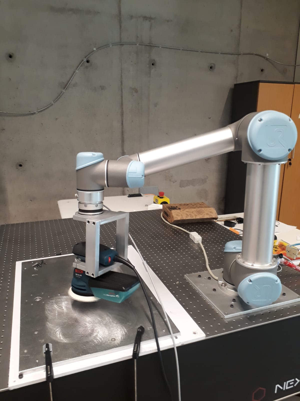 Test Setup and System Integration: Our industry partner Arcelik A.S. donated a mobile manipulator that includes a MiR mobile robot base and a Universal Robot UR5 robot arm. Per Arcelik’s request, the metal sheet polishing was the primary focus. To that end, an apparatus to attach a commercially available polisher to the robot end-effector was built and tested for mechanical loading. Furthermore, a 6-axis Force/Torque sensor was mounted on the robot end-effector as well to measure interaction forces. In order to ensure flexible and real-time operable control, a ROS-based operating system was installed and the fastest possible real-time operation for UR5 has been activated: 8 ms.