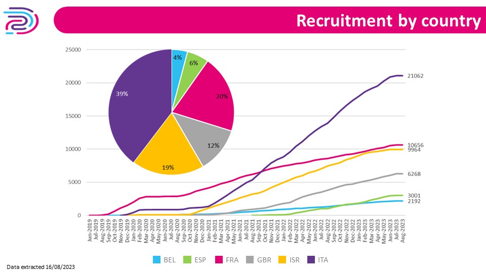 The first study participant was recruited in France on July 18, 2019, followed by Belgium (October 22, 2019) Italy (December 13, 2019), Israel (December 18, 2019) and UK (October 20, 2020). Recruitment was suspended due to the COVID-19 pandemic from March to September 2020 and continued to be hampered by successive epidemic waves thorough 2021-2022.