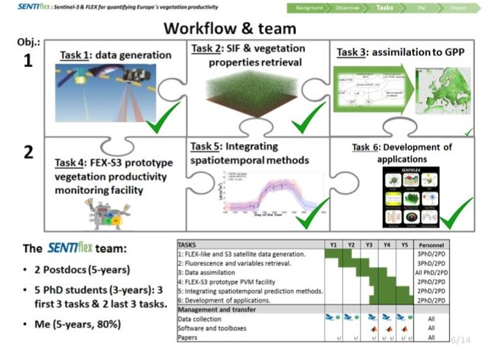 Task 2: SIF & vegetation properties retrieval. Retrieval algorithms have been developed for both FLEX-FLORIS and S3 OLCI data, and their synergy. The following algorithms have been successfully validated: leaf area index (LAI), leaf chlorophyll content (LCC), fraction of absorbed photosynthetically active radiation (FAPAR) and fractional vegetation cover (FVC). Also a SIF retrieval toolbox is under development. It led to several publications. Currently, retrieval models have been implemented into Google Earth Engine (GEE) for S3 data processing at the European scale. First European maps have been generated.