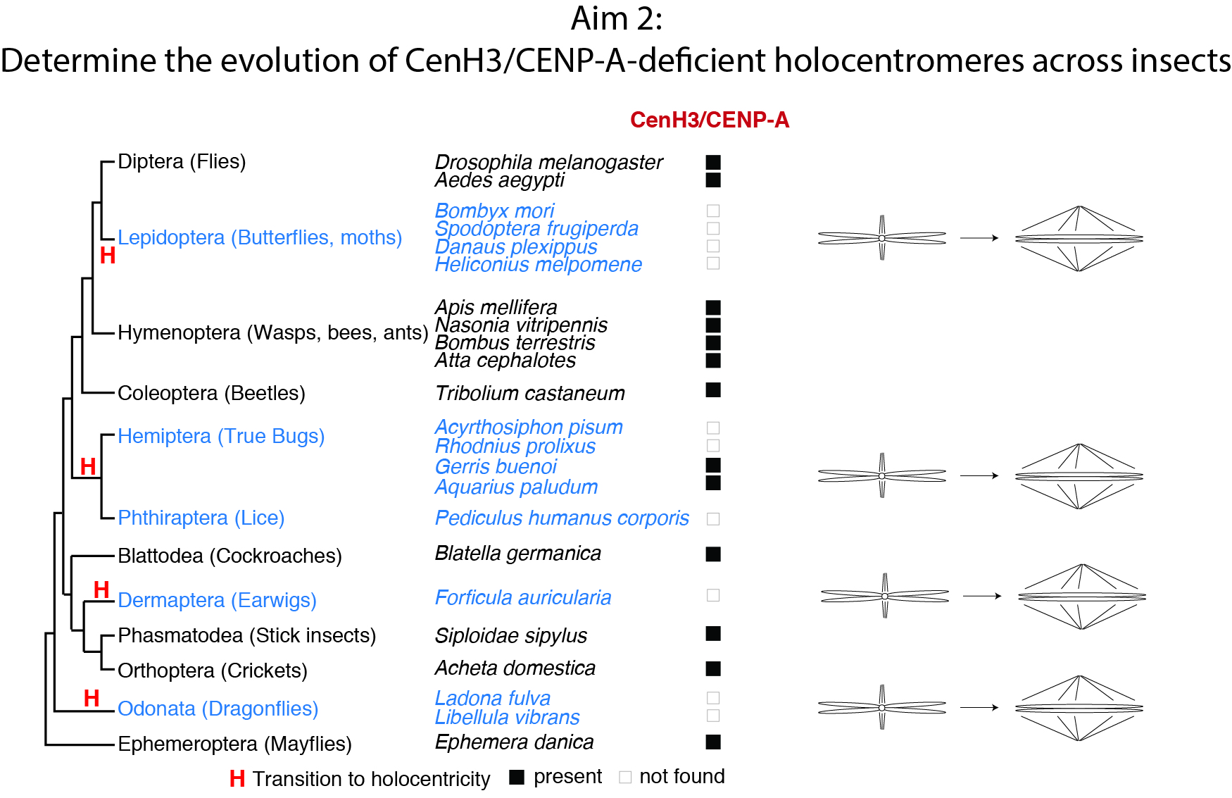 For Aim 2 about the evolution of CenH3/CENP-A-deficient holocentromeres across insects, we are mapping kinetochore components across mono- and holocentric insect species to test for a recurrent evolution to similar CenH3/CENP-A-independent kinetochore assembly pathways. Part of these results are included in our recent publication.