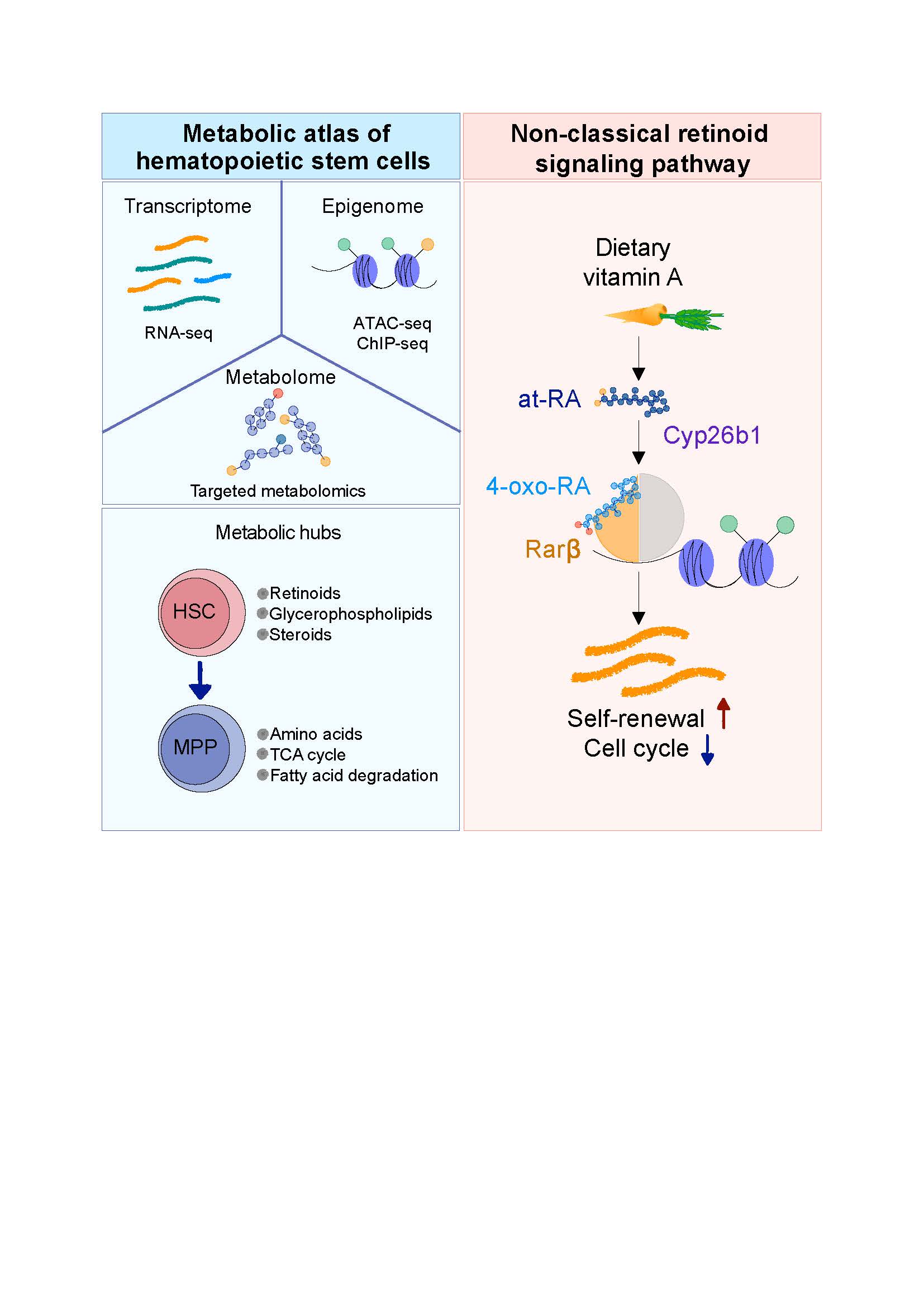 In VitASTEM we uncovered a non-classical retinoic acid (RA) signaling axis that regulates HSC function. We show that HSCs rely on Cyp26b1, an enzyme conventionally considered to limit RA effects in the cell. In contrast to the traditional view, we demonstrate that Cyp26b1 is indispensable for production of the active metabolite 4-oxo-RA. Further, RA receptor beta (Rarb) is required for complete transmission of 4-oxo-RA-mediated signaling to maintain stem cells. Further, in VitASTEM we established state-of-the-art low input technologies and generated low-input metabolomics, transcriptomics, chromatin accessibility, and chromatin immunoprecipitation data, revealing distinct metabolic hubs that are enriched in HSCs and their downstream multipotent progenitors. Our findings emphasize that a single metabolite controls stem cell fate by instructing epigenetic and transcriptional attributes.
