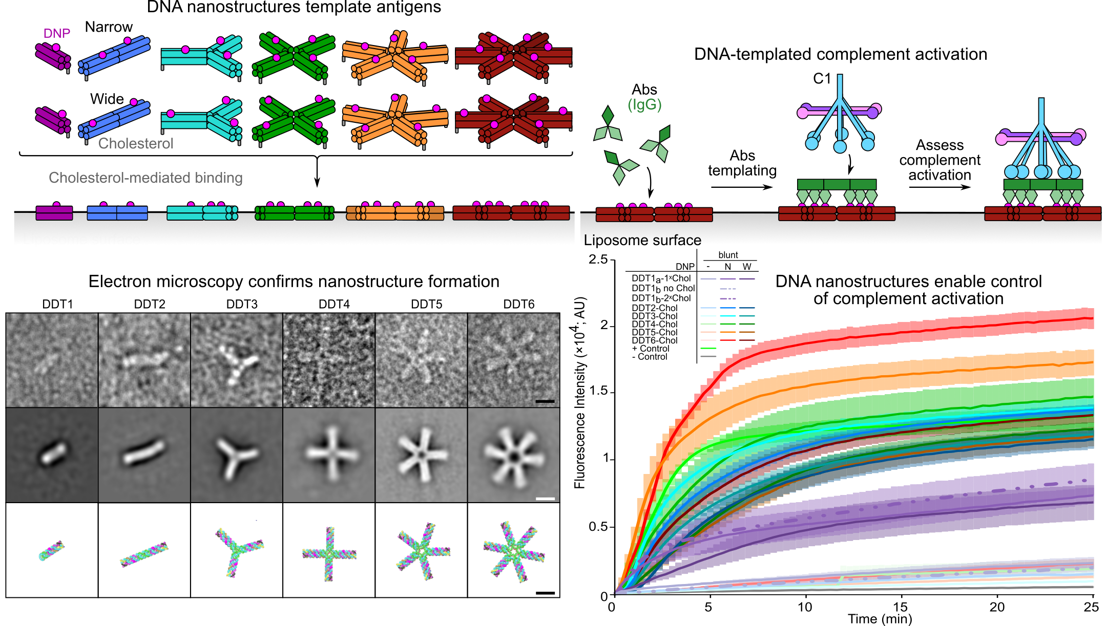 The first aim of this proposal aimed to understand the role of nanopatterns in complement activation. We developed DNA nanostructures able to nanopattern antibodies, to which the C1 complex bound with the specific geometry. This allowed us to explore the relationship between geometry and Complement activation, which manifested as a relationship between antibody valency and C4b deposition. C4b is the product of the C1 enzyme, and we therefore discovered how antibody valency can modulate C1 activity. This relationship extended to membrane lysis – the name number of antigens nanopatterned as a hexagon was most potent, and this decreased from 5, 4, 3, and 2 antigens. Note that the same number of antigens were present, but were nanopatterened using DNA to form defined patterns. This work will have important consequences for antibody engineering and therapeutic modulation, but also highlights the importance of protein geometry in immune system activation.