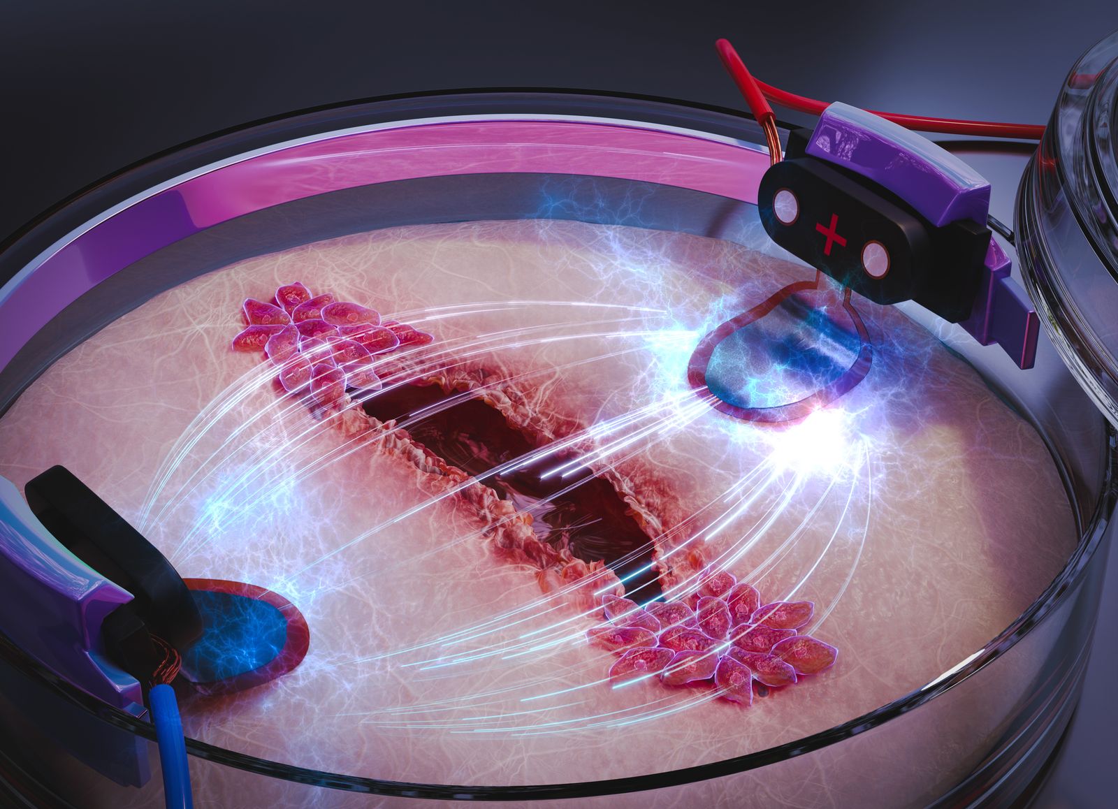 The working hypothesis of SPEEDER has been that electrical fields (EFs), applied over an open wound, act as a guidance signal for skin cells involved in re-epithelialization. In other words, we exploit skin cells’ “electrotactic” ability to manipulate and force them to move faster into the wound area. The idea of such a concept is not original to SPEEDER and has, in fact, been explored in numerous studies but with inconsistent outcomes. A key component has been missing for successfully exploiting electrotaxis, mainly an electrode material capable of sustaining direct current (DC) stimulation over long periods without dissolving the stimulating electrodes and damaging surrounding tissue. SPEEDER has managed to close this gap by working in parallel on biological models, materials science, and electrochemistry.