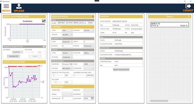 - We developed sensors to detect AA and NO gases. The best solution to quantify acetic acid produced during the degradation of acetic acid films, considering performance, space requirements, and power consumption, appeared to be the one based on a multiarray of two nanomaterial-based MOS with signal post-processing. On the other hand, to monitor nitrogen oxide and nitrogen dioxide produced by the degradation of cellulose nitrate, the best solution was reached by employing two electrochemical sensors, one selective for nitrogen oxide, the other selective for nitrogen dioxide.