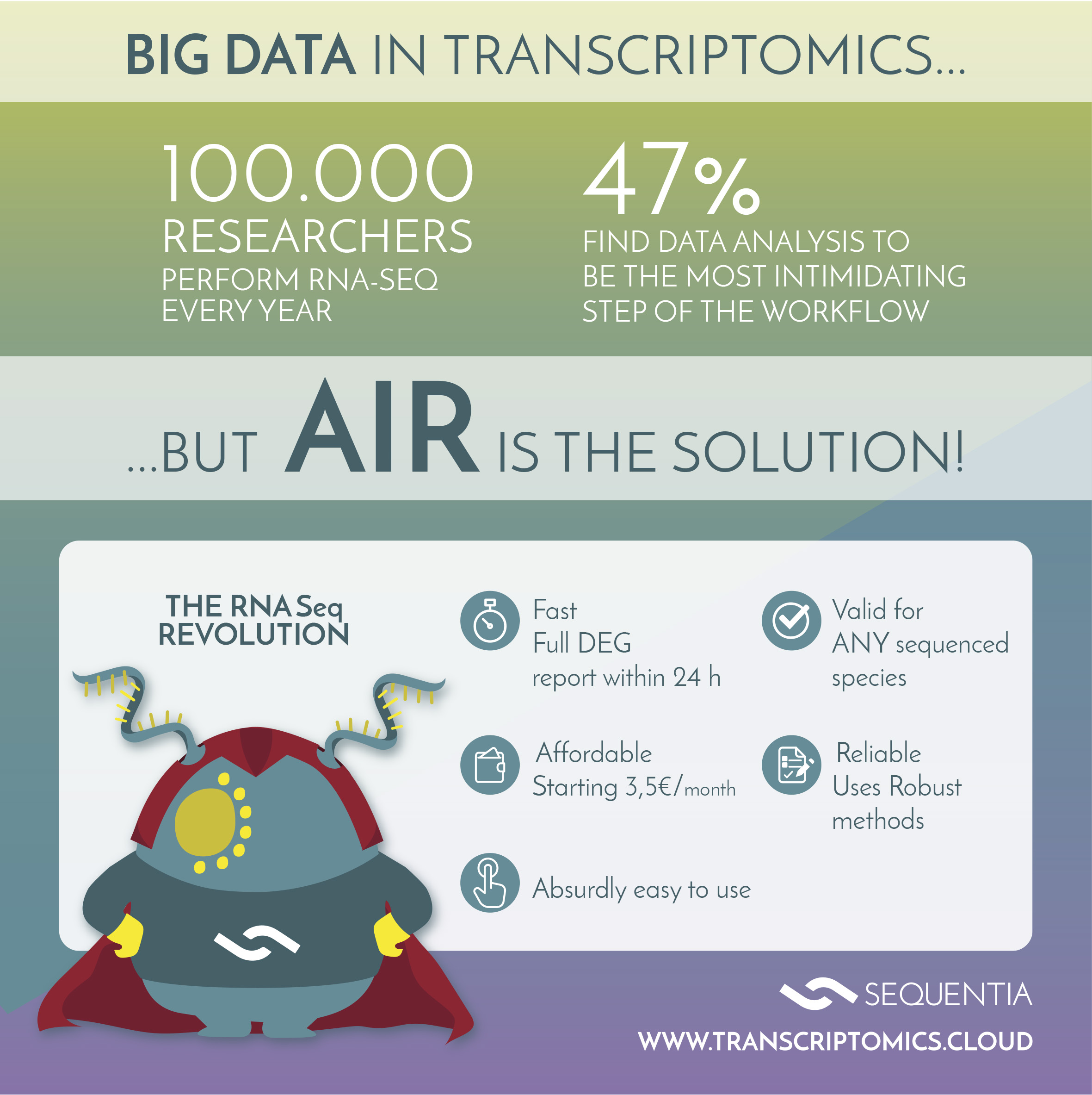 The advent of new technologies has genomics extending its reach into many diverse fields, from biomedicine to agriculture to clinical diagnostics. Whole-genome sequencing is filling the gap in our understanding of not only genome sequence but also of genome organization, genetic variation, differential gene expression and diverse aspects of transcriptional regulation. The sequencing platforms of today (Next Generation Sequencers) are much more powerful and faster, but they also generate huge volumes of data (Big Data) which needs to be sorted, organised, curated, annotated, integrated, analysed and interpreted. Bioinformaticians have a key role here as they have the necessary combination of biological and informatics knowledge. However, because the technology grew so rapidly, there is a worldwide lack of availability of skilled personnel, which is one of the key factors restraining the growth of this market. This gap in the market has resulted in a bottleneck in terms of data analysis, storage and interpretation, whereby most geneticists and biologists are left struggling to manage their own data due to the sheer volume and complexity of it. Most tools available today require scientists to be well versed in programming and scripting in order to run them, which they are not. Also, due to the diversity of applications in genomics, bioinformaticians rarely have the depth of knowledge required to truly understand the biological “problem” of the researcher, and thus are unable to come up with a practical solution. Our product is a breakthrough solution which aims to target this gap between data production and analysis, specifically in the study of transcriptomics via RNA Sequencing. RNA Sequencing, introduced in 2010, has rapidly established itself as the number one method for transcriptome studies and, in turn, transcriptomics is the most relevant omic science. Our solution is called A.I.R: Artificial Intelligence RNAseq. A.I.R. is the first SaaS (Software as a Service) solution of its kind: an easy-to-use software built with solid scientific methods. A.I.R. is revolutionary in that it is able to solve three important obstacles in the genomics field simultaneously: i. the informatics problem (specifically data storage, automatization of results and duration of analysis) ii. the scientific problem (data interpretation and data integration, as well as providing new bioinformatic and statistical functions) iii. the social problem (the lack of availability of skilled bioinformaticians). The overall objective of this project is to introduce a disruptive innovation that will allow researchers to perform transcriptomics data analysis easily, quickly and affordably. The specific objectives are to improve A.I.R.’s current performance to take it from its current TR7 (trial) stage to its final version, and to carry out a feasibility study to launch A.I.R. into the market.