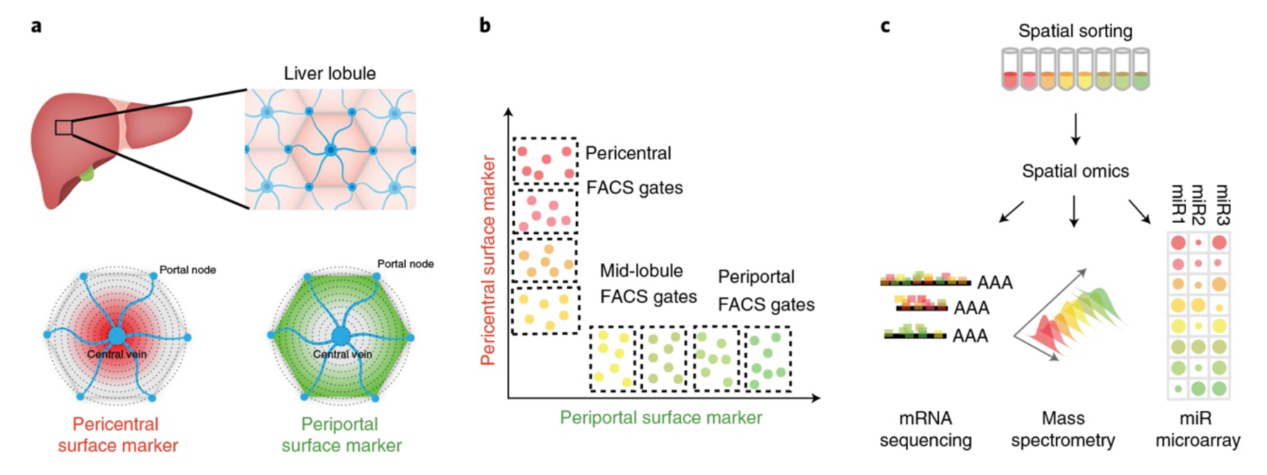Given these fundamental questions in tissue biology, we set out to develop a generic approach that we termed ‘spatial sorting’ to measure any cellular feature along the tissues’ recurring axes. Spatial sorting is based on the usage of transcriptomics-based zonation atlases to identify zonated surface markers. Upon tissue dissociation, cells are incubated with a cocktail of spatially informative zonated surface markers, and gated so that hundreds of thousands of cells can be obtained in a spatially stratified manner (Ben-Moshe et al., Nature Metabolism 2019).