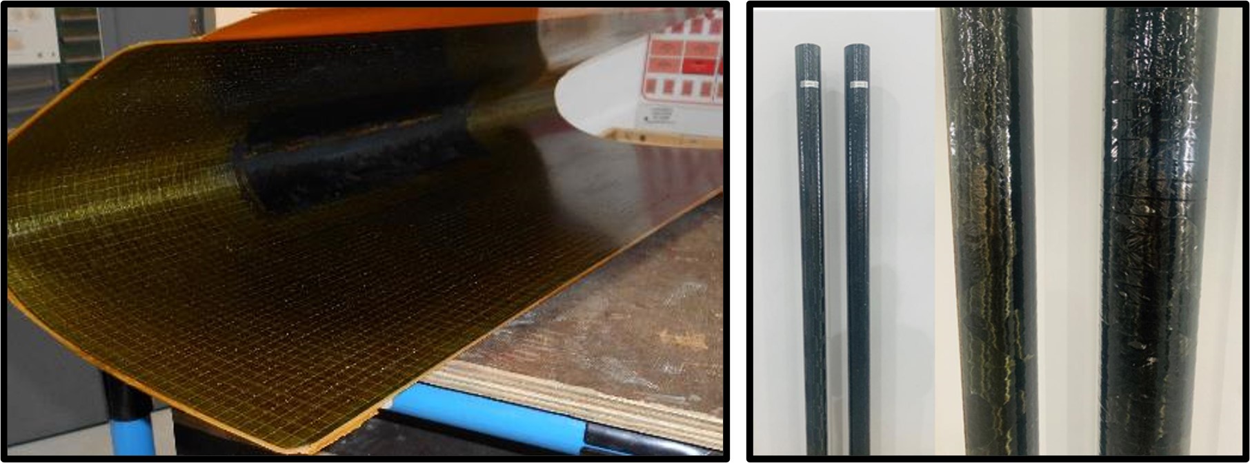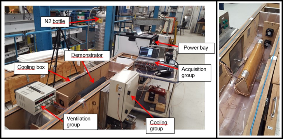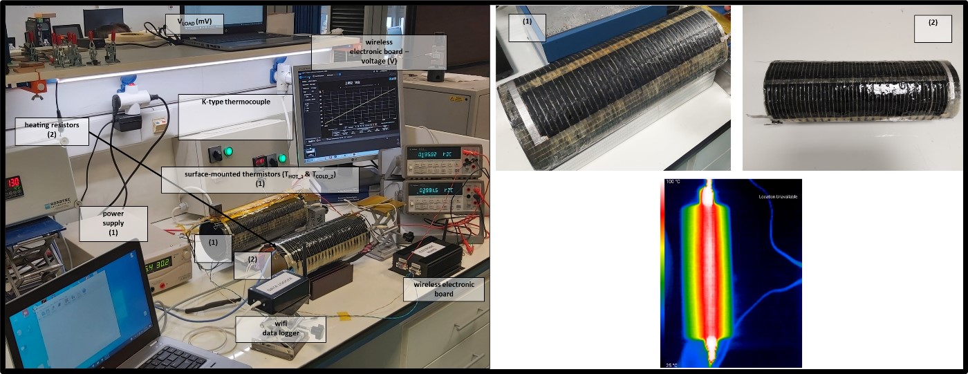 Finally, the two demos (tubular and planar one) with 3R prepregs and integrated TEG devices were manufactured, based on the combined acquired knowledge. Demonstrators were manufactured by SON, AIR and B&T (Fig. 6) and were controlled for quality using NDT. The demonstrators were instrumented for testing both at lab scale and simulated operational environment (Fig. 7 and Fig. 8) to increase the TRL. SON, UOI & B&T performed various tests and established the efficient power generation to enable the wireless SHM system developed by TELE. Impact tests were performed on representative coupons and the remarkable repairability of the 3R resin was demonstrated.