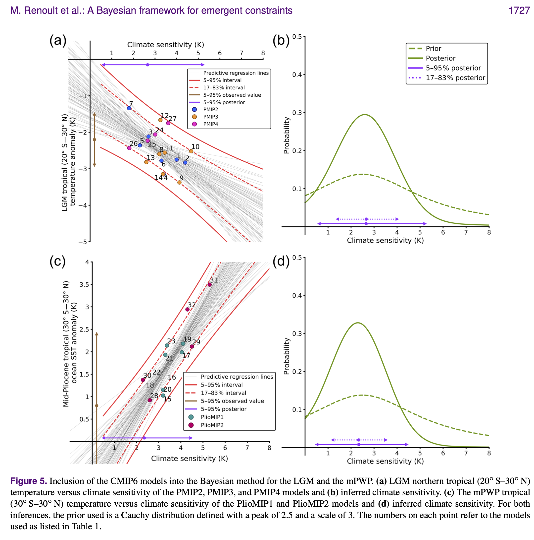 Looking instead at pre-historic climates offers a better chance at bounding ECS. This is because these climates are usually close to equilibrium with the given boundary conditions, but the drawback is that the state, and also the boundary conditions, are less well known. In Renoult et al. (2020) we use the emergent constraint technique to establish the relationship between cooling in the Last Glacial Maximum (LGM) about 20 thousand years ago, warming during the Pliocene epoch about 3 million years ago and ECS using climate models. This relationship can then be used to determining ECS given estimates of the actual cooling and warming during these periods. There are, however, several challenges with using the cold LGM to predict a warm future (Renoult et al. 2023).